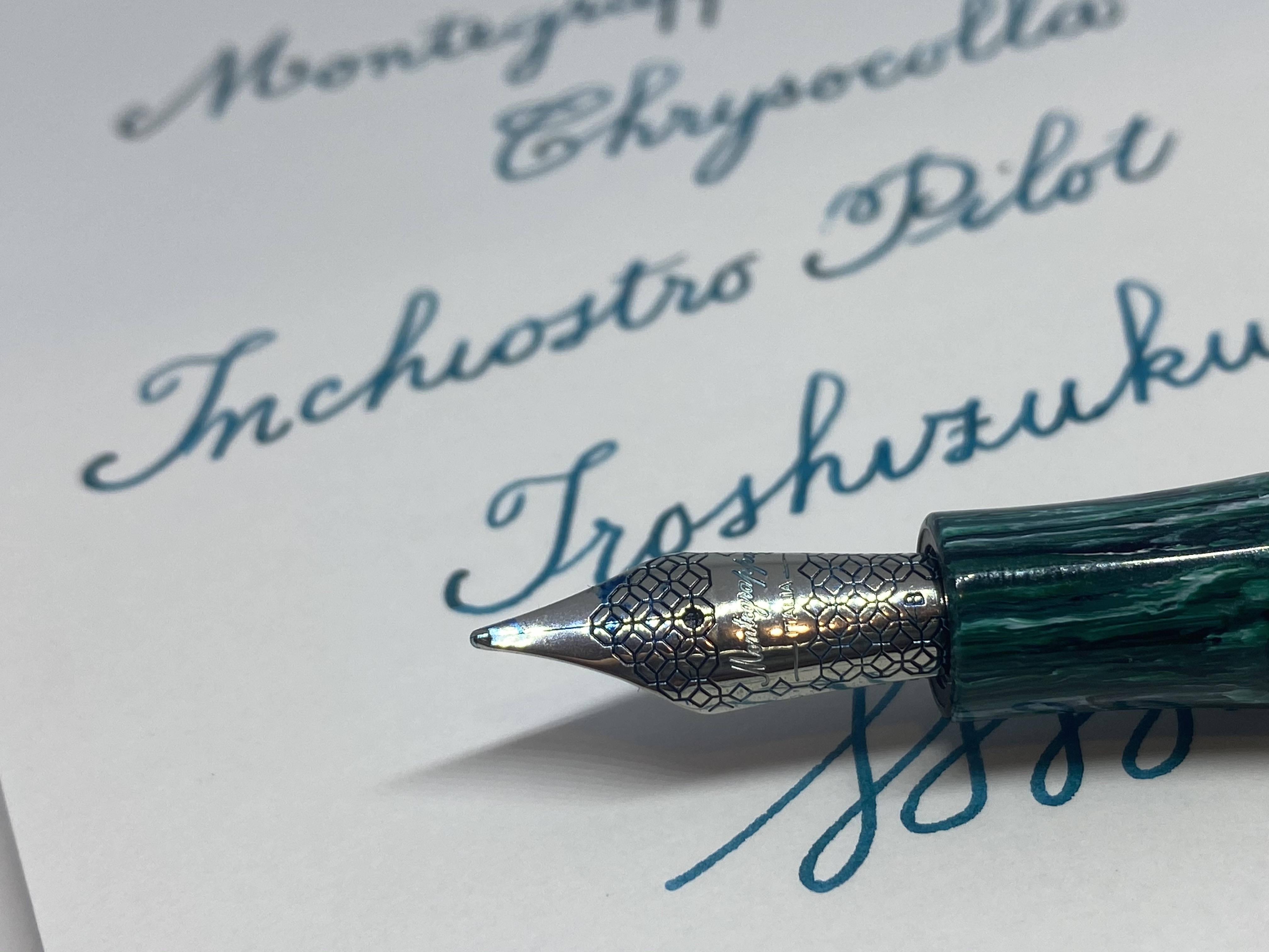 spiega meglio, vorresti vedere il colore della chrysocolla a confonto con una Pelikan 400 (o Morntegrappa Armonia o Manager, che tuttavia non ho mai viste)? e perché?
