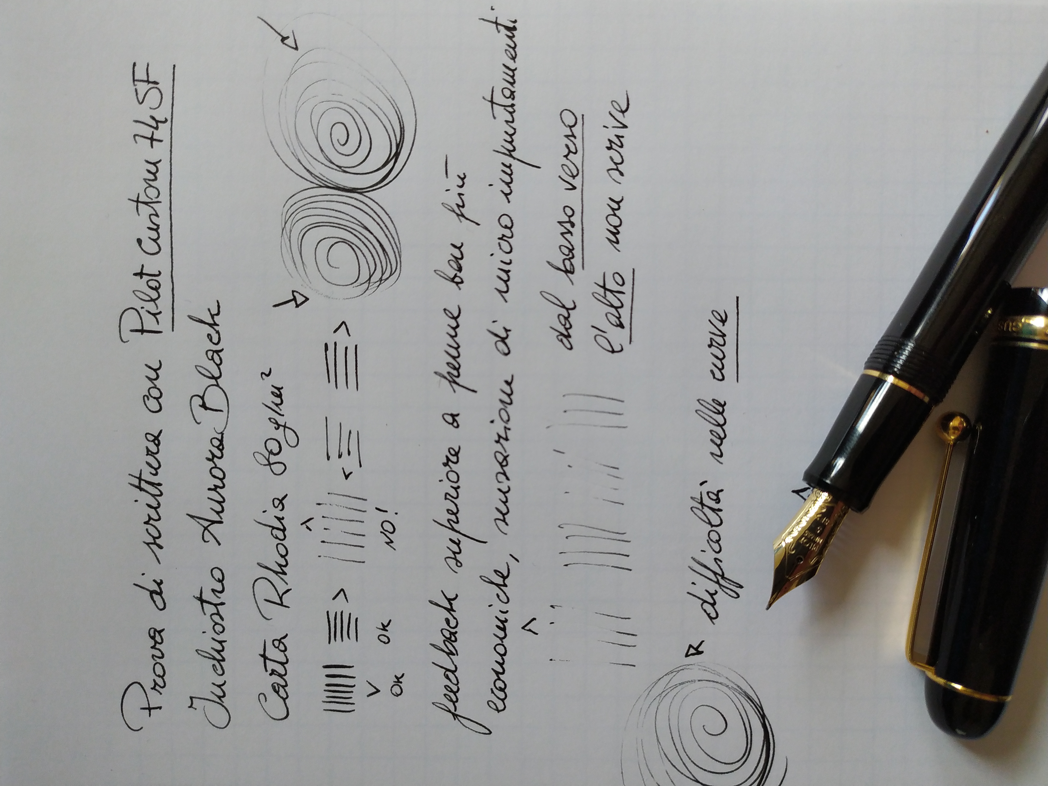 Ma veniamo alla Pilot. Allego una foto di una prova di scrittura. Nonostante l'inchiostro molto fluido e la carta scorrevole, si verificano delle difficoltà in alcune direzioni e a volte ho la sensazione di micro impuntamenti che rendono la penna poco scorrevole e la scrittura poco piacevole.