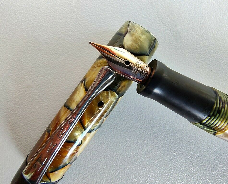 Si tratta di una vecchia Haro (non saprei di che epoca, anni '30?), vecchia marca minore tedesca, in questo caso in versione "Luxus", con un pennino in oro marcato "Quadretti" (immagino sostituito ad un certo punto).