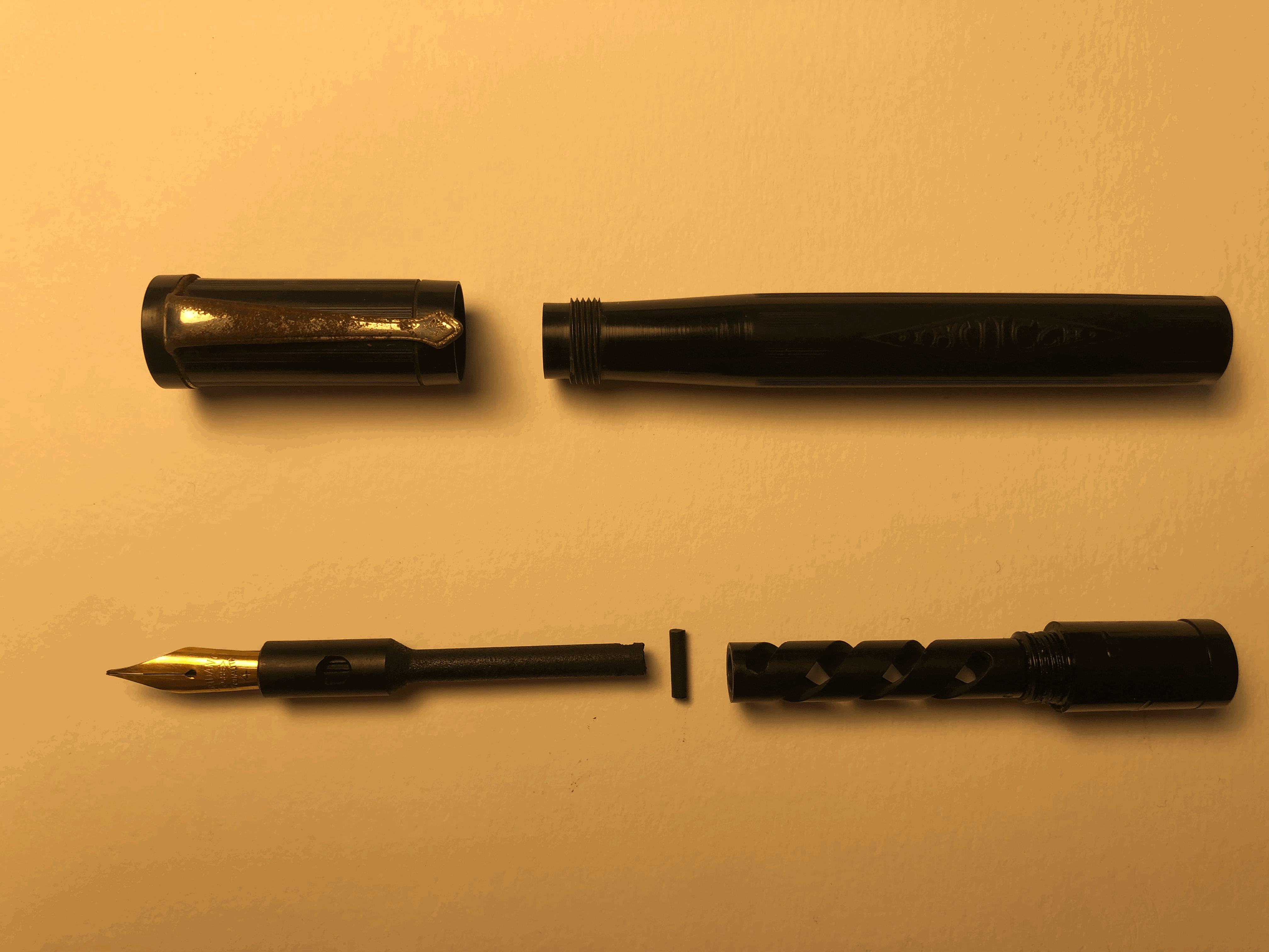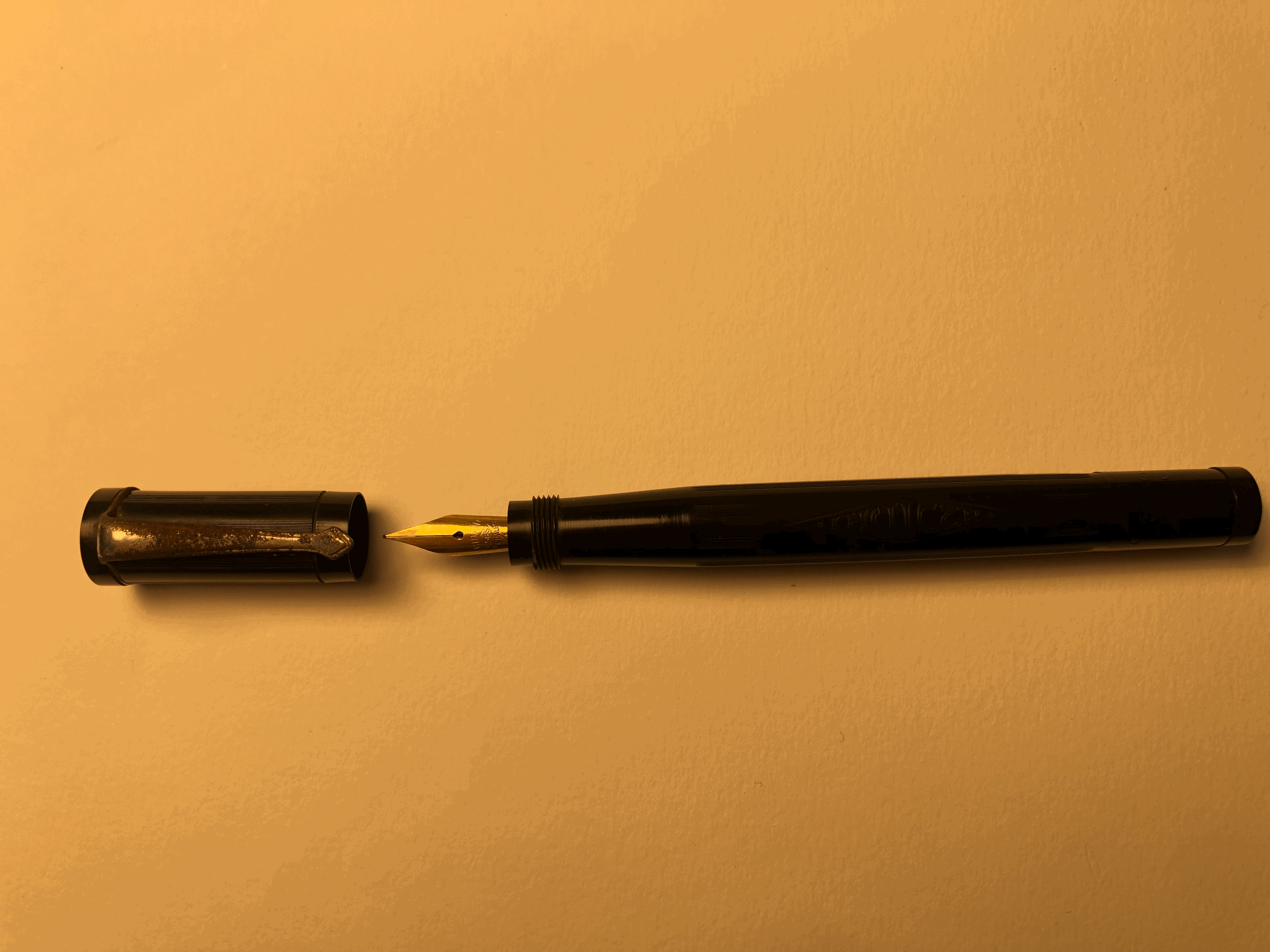 Tra le altre vi è la penna in oggetto: una Invicta rientrante che presenta la parte interna del pennino ( pennino Eridano) rotta e una scarsa tenuta della guarnizione sul fondello.