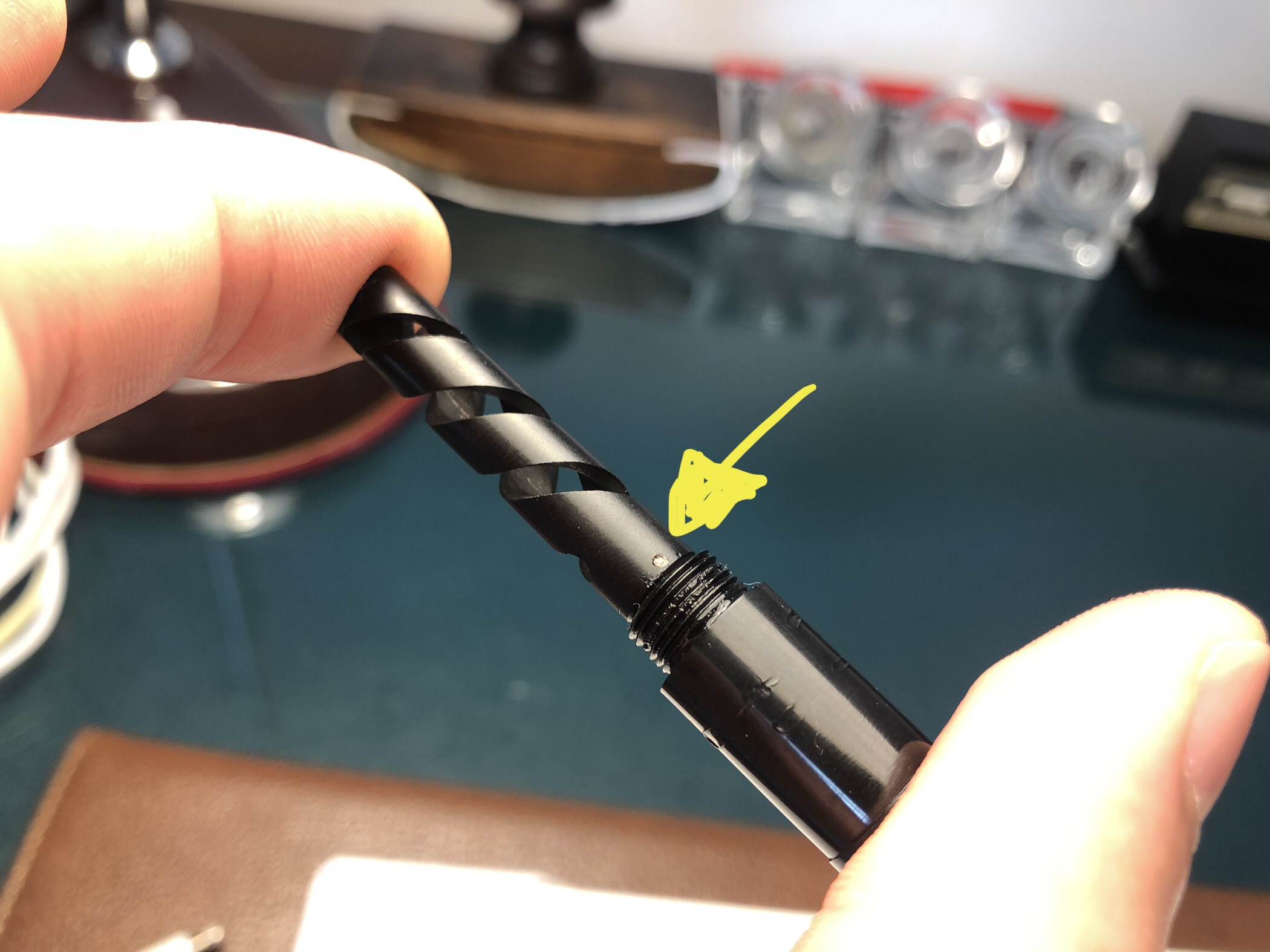 Ora, il pennino non mi da problemi perché funziona e comunque è di semplice sostituzione ma purtroppo faccio fatica a mettere le mani sulla guarnizione: come si vede nelle foto sembra esserci un piccolo perno che tiene saldamente fissata la spirale alla parte di giunzione di quest'ultima con il fondello (spero in foto si veda, metto anche una foto con evidenziato il piccolo perno).