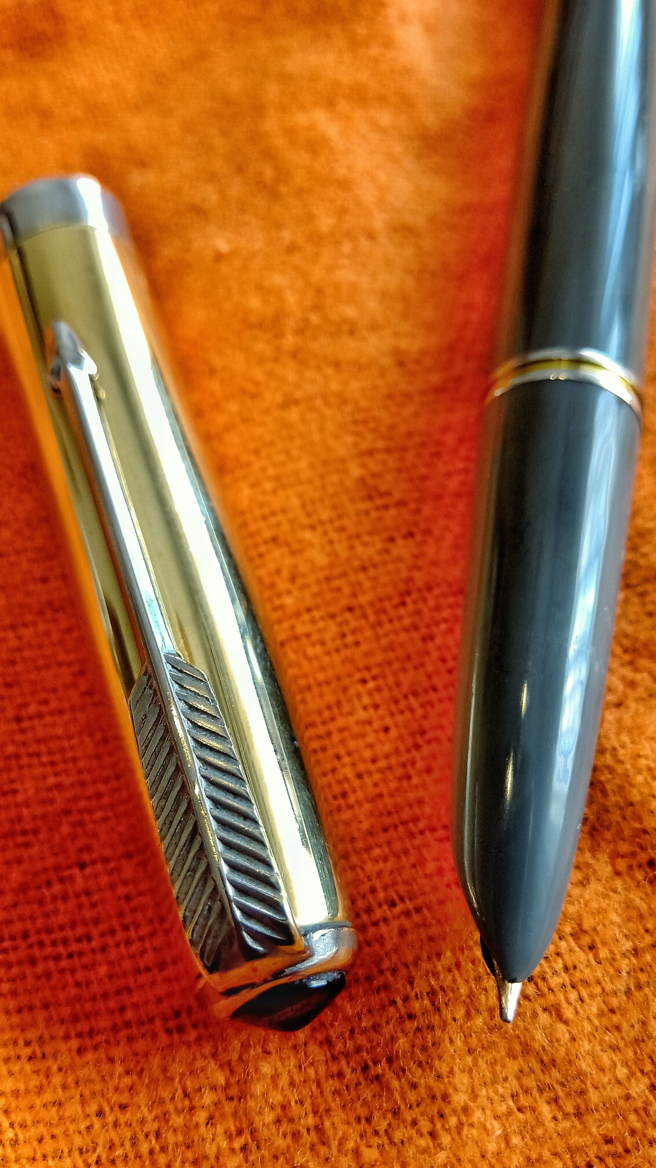 The first Parker, which really stumped me, I got it from a fountain pen lot, and it really was in a painfull state... The pneumatic loading system smashed, the cap scored, dented, and without the jewel, the clip bent, and the barrel with deep stains on the material... But it had something very striking..., the body was not made of Lucite, was made of celluloid, the clip was strikingly different from the rest, and the cap was in two colors...!!! It was worth the restoration work...