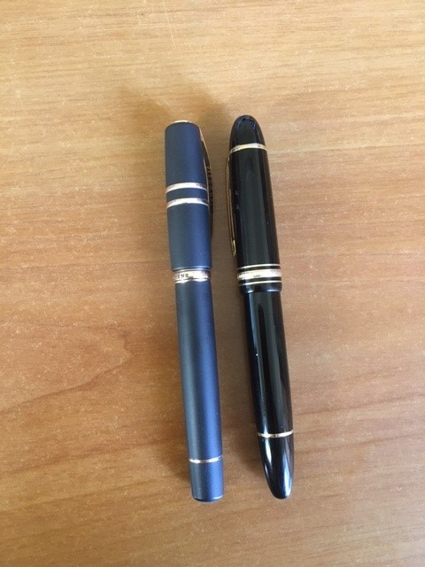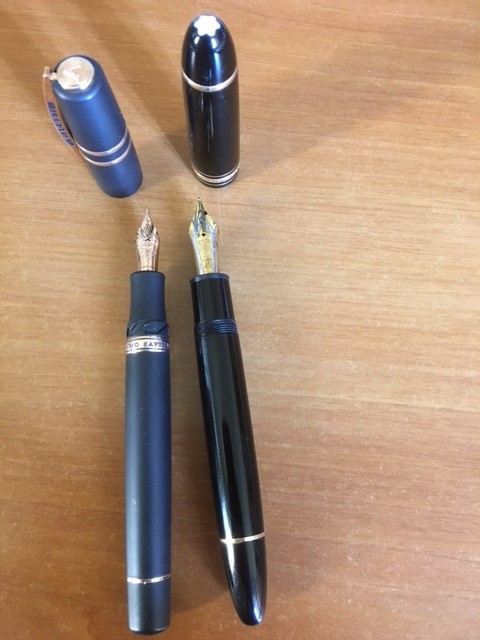 Di seguito metto una foto della HS vicino alla 149. Non le ho misurate ma ad occhio e a sensazione tenendoli in mano la HS ha una circonferenza leggermente minore rispetto alla 149. Impugnandola invece per scrivere mi risulta molto più comoda della 149, questo perché la sezione scrittura è più svasata rispetto alla 149.