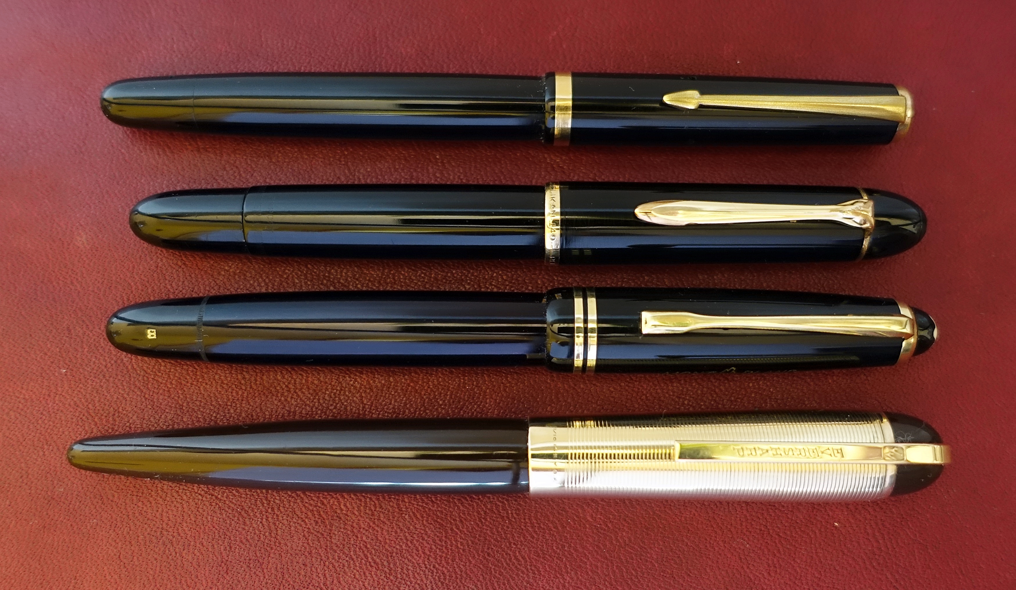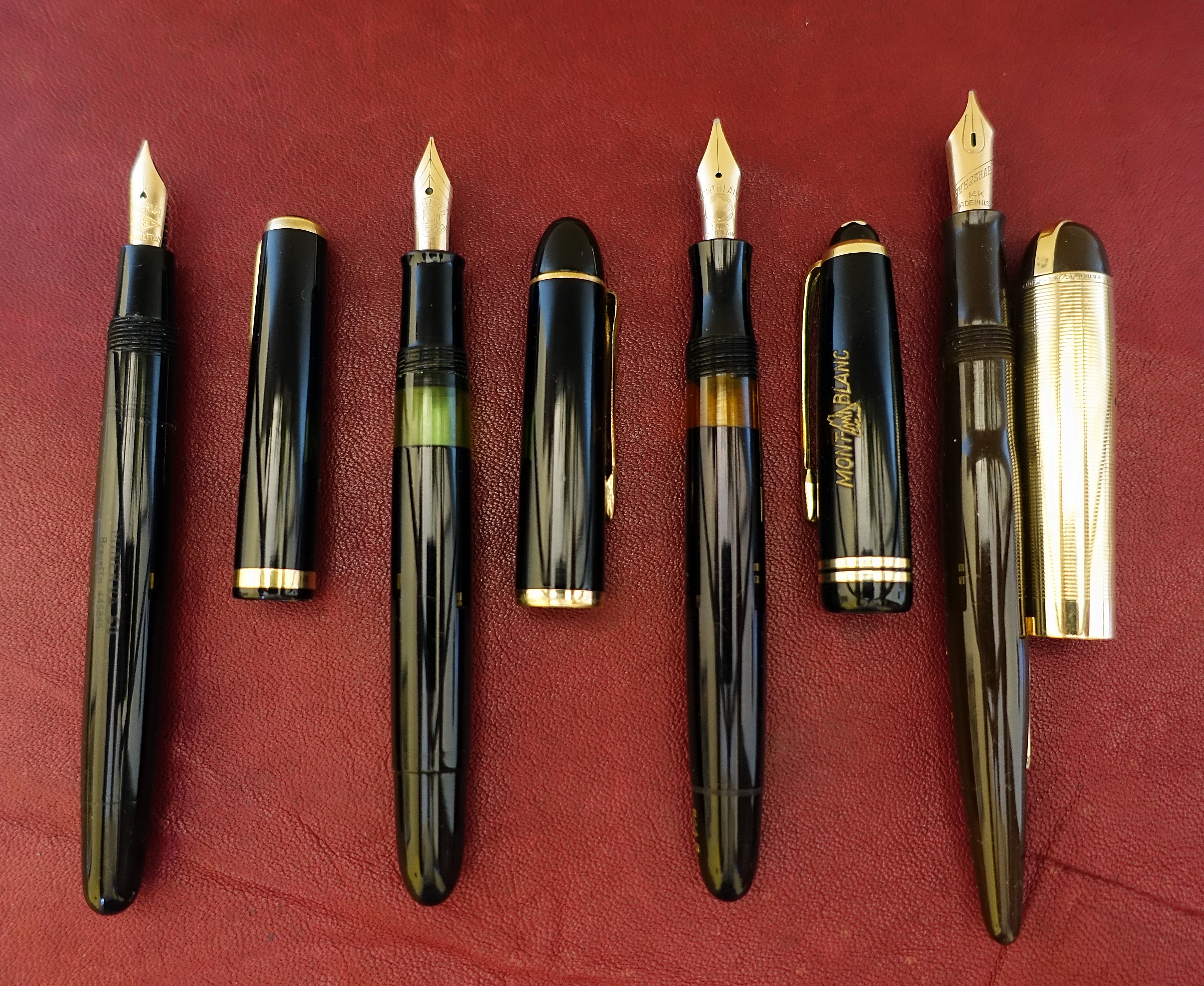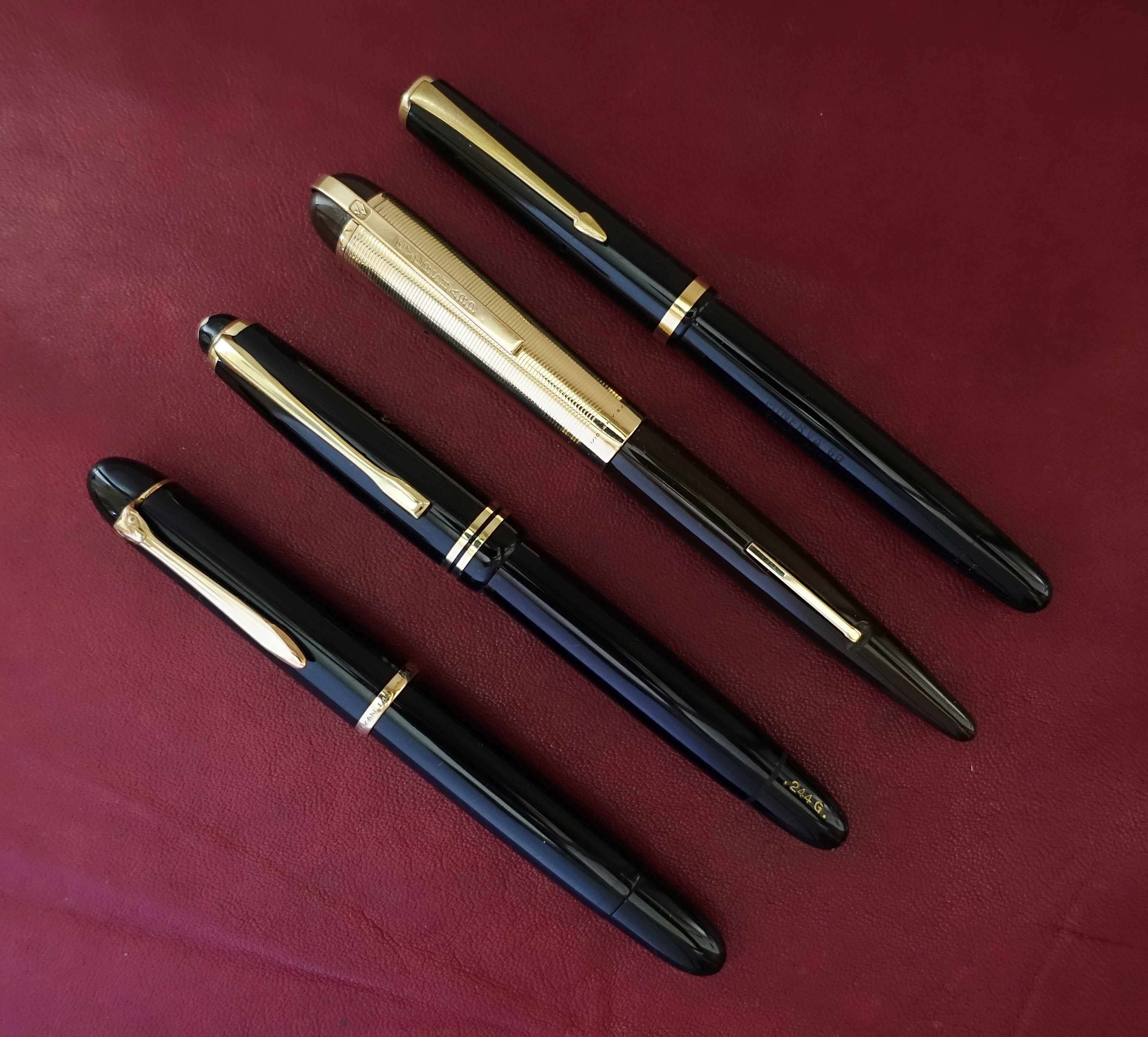 Ultimi acquisti. Minerva 60, Pelikan 140 primo modello, clip stretta e, scritte sul fondo del fusto, Montblanc 244G, Eversharp Skylab. Tutte in splendido stato, la 244G non ha mai visto l'inchiostro, praticamente nuova, le altre lo hanno visto di passaggio, credo poco. ;)