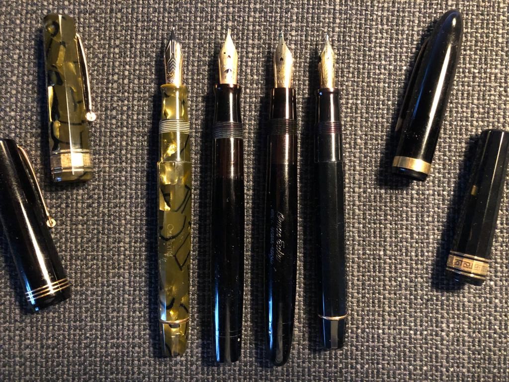 La flat-top é quasi con certezza una Lucens, ma per sapere se si tratta di una taglia grande o extra-grande (o alternativamente media o grande, come vogliano le parole) bisognerebbe misurarla. Una Lucens a stantuffo é lí, nel novero delle penne che prima o poi mi piacerebbe molto avere.