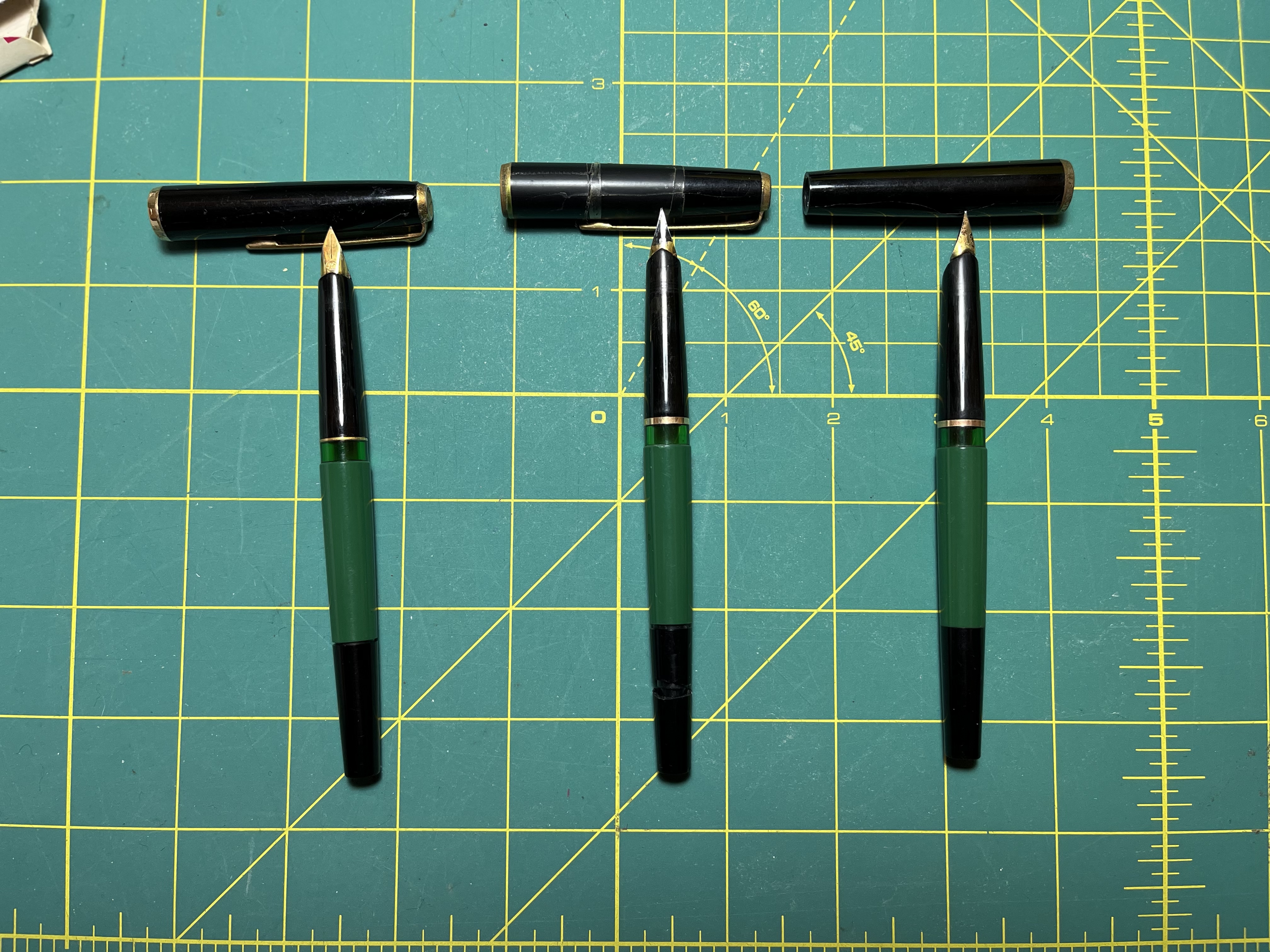 Mio papà ha trovato in un cassetto queste 3 Pelikan che erano di mio nonno, sembrano uguali ma ognuna ha qualche particolare differente (cappuccio, pistoni bloccati, ecc).