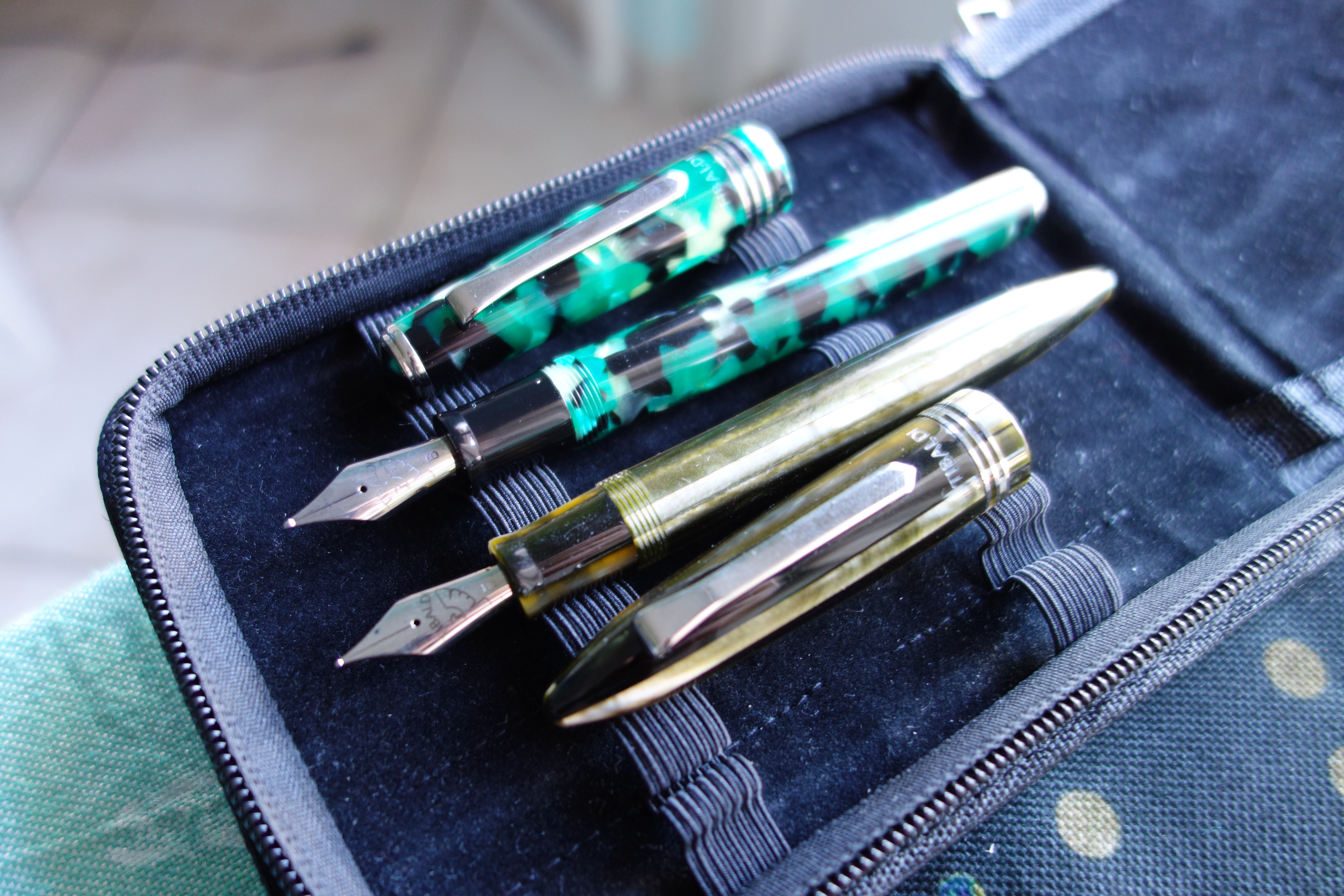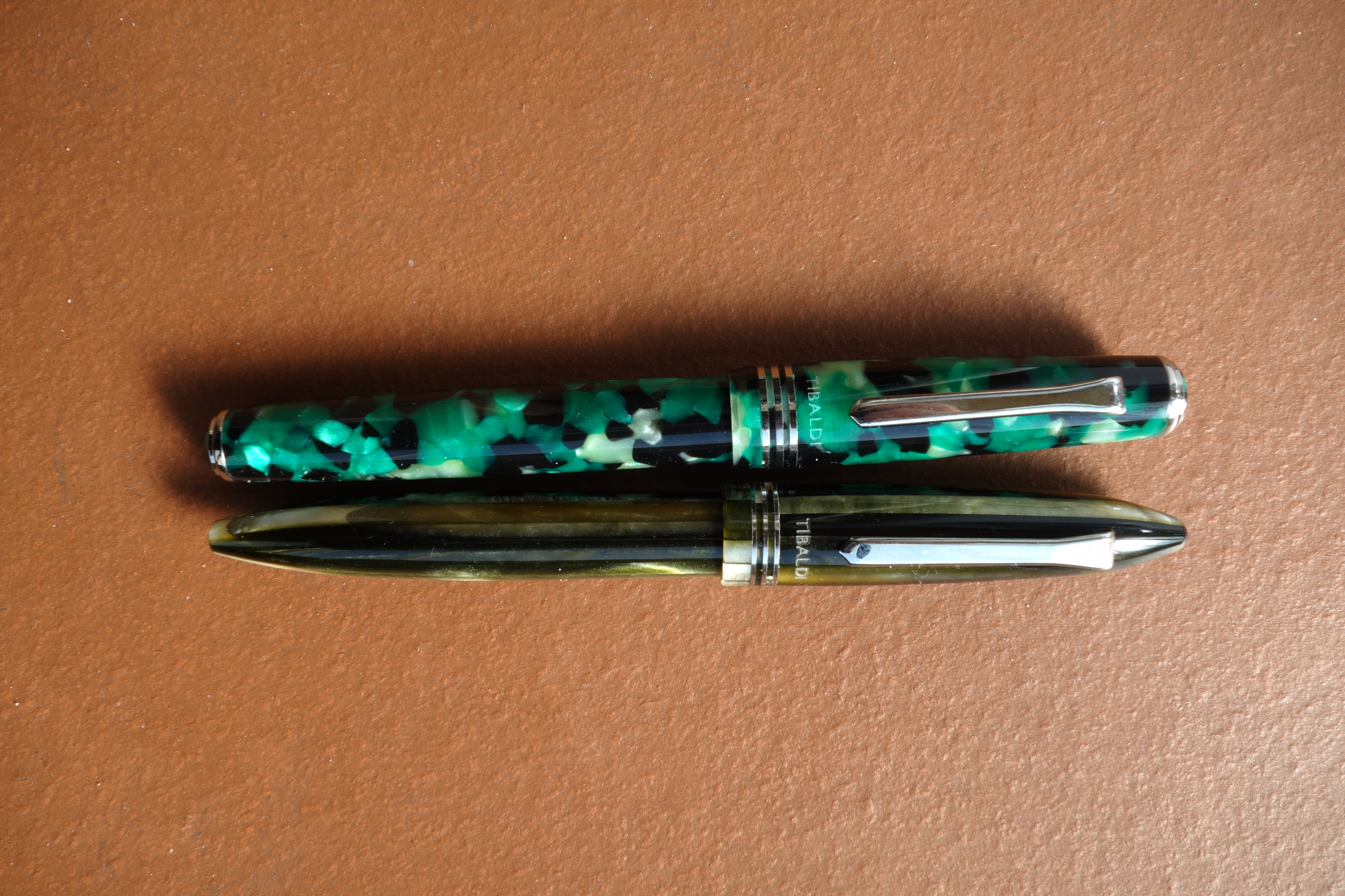 Continuando nella mia perversa ossessione per le penne nostrane mi sono regalato per natale queste due, a mio avviso bellissime, stilografiche della Tibaldi, Bononia Martini Olive e N60 verde Smeraldo (combinazione livree presa liberamente...dopo aver visto il video del buon dottor Stephen Brown).