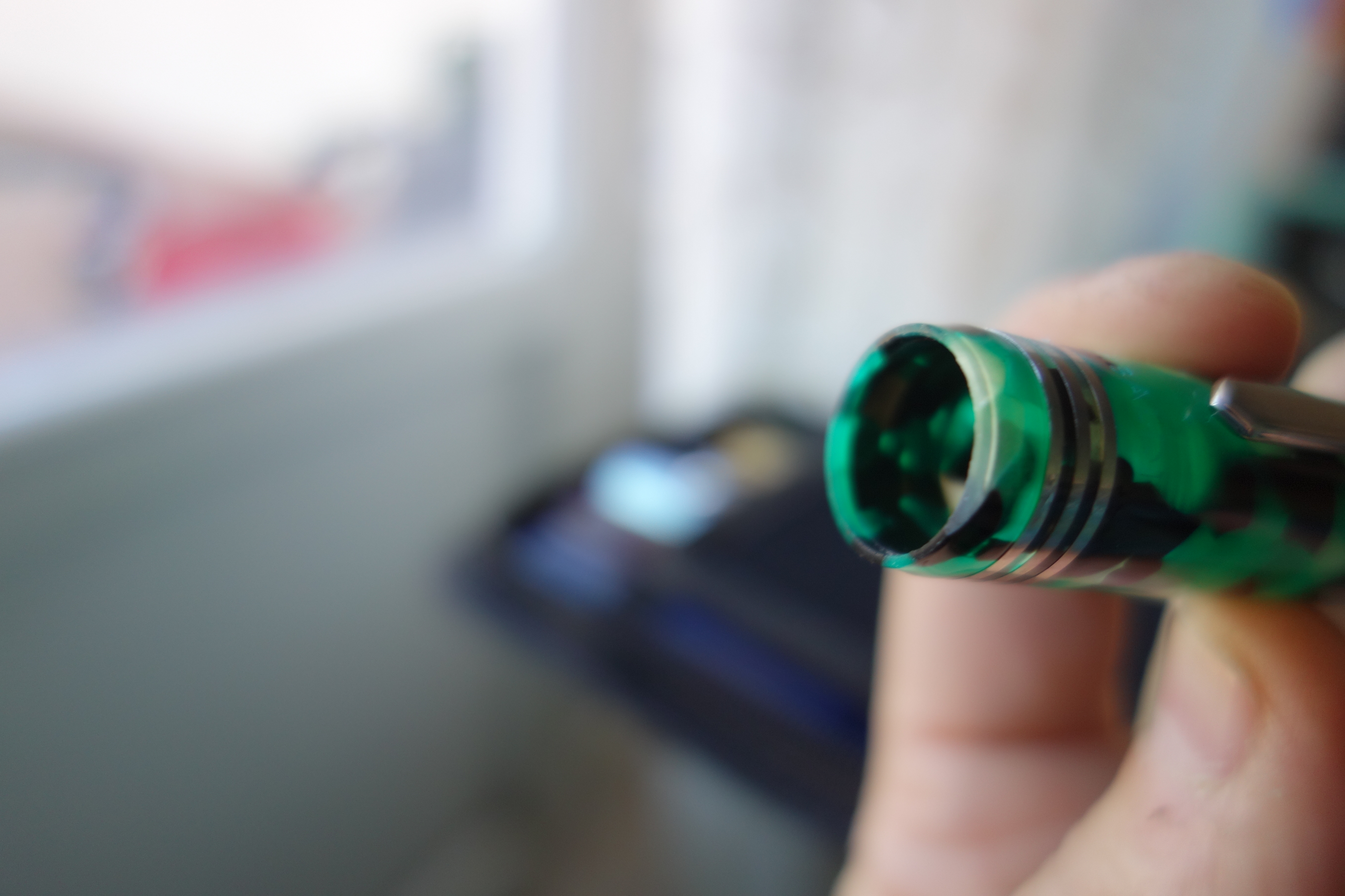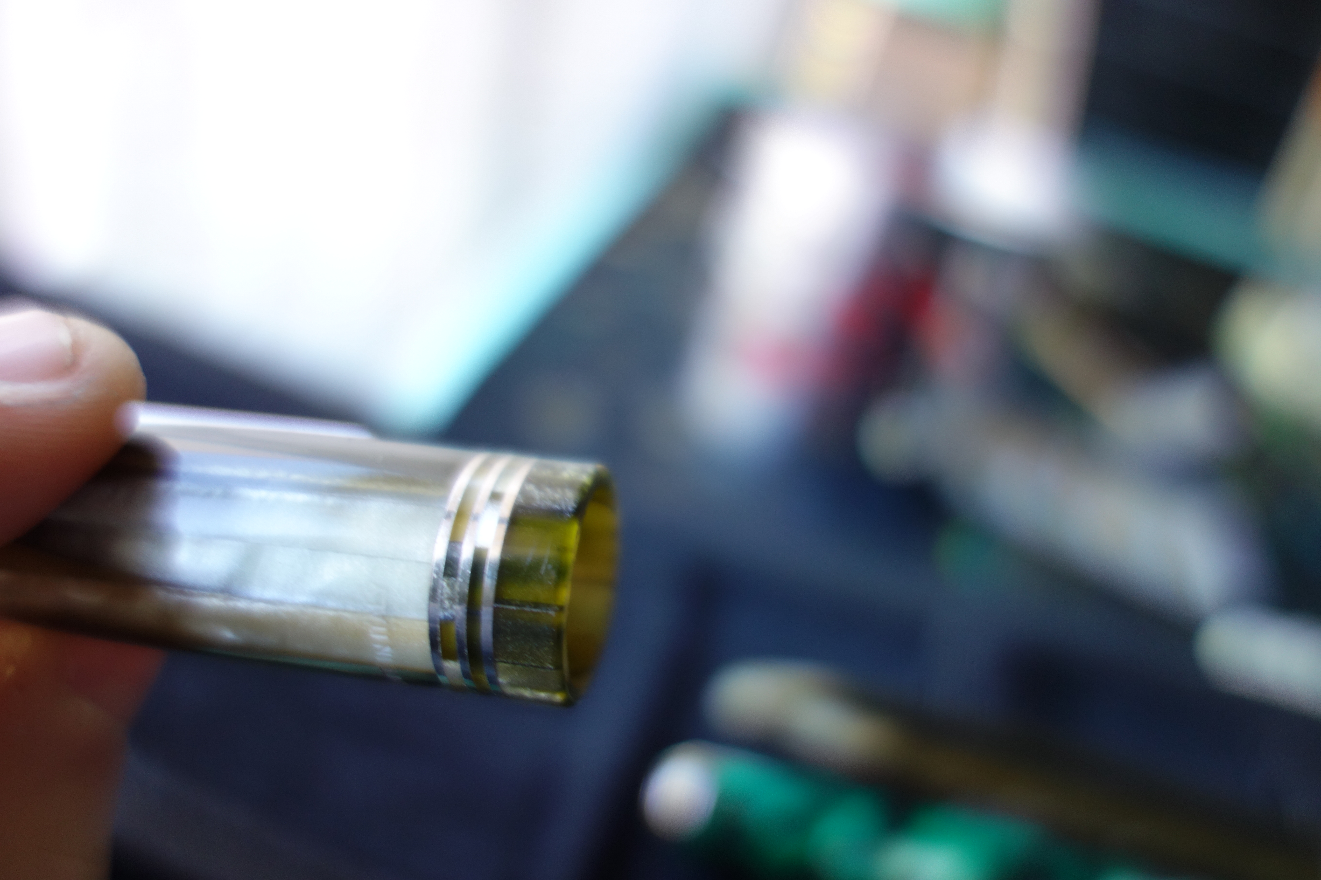 1. Sul cappuccio si creano le scanalature in cui si vanno a posizionare gli anelli che vengono poi stretti con apposito utensile. Questo è il sistema che veniva utilizzato una volta. Oggigiorno sono in pochissimi a farlo, ci vuole una macchina particolare che ho visto nei laboratori di Leonardo. Oltre a specifici modelli di quest'ultimo marchio, a mia conoscenza, anche la Aurora Internazionale usa questa tecnica. Il vantaggio è che non vi è soluzione di continuità del motivo del materiale ma richiede molta attenzione e maestria, pena vedere delle spiacevoli ondulazioni sull'anello.