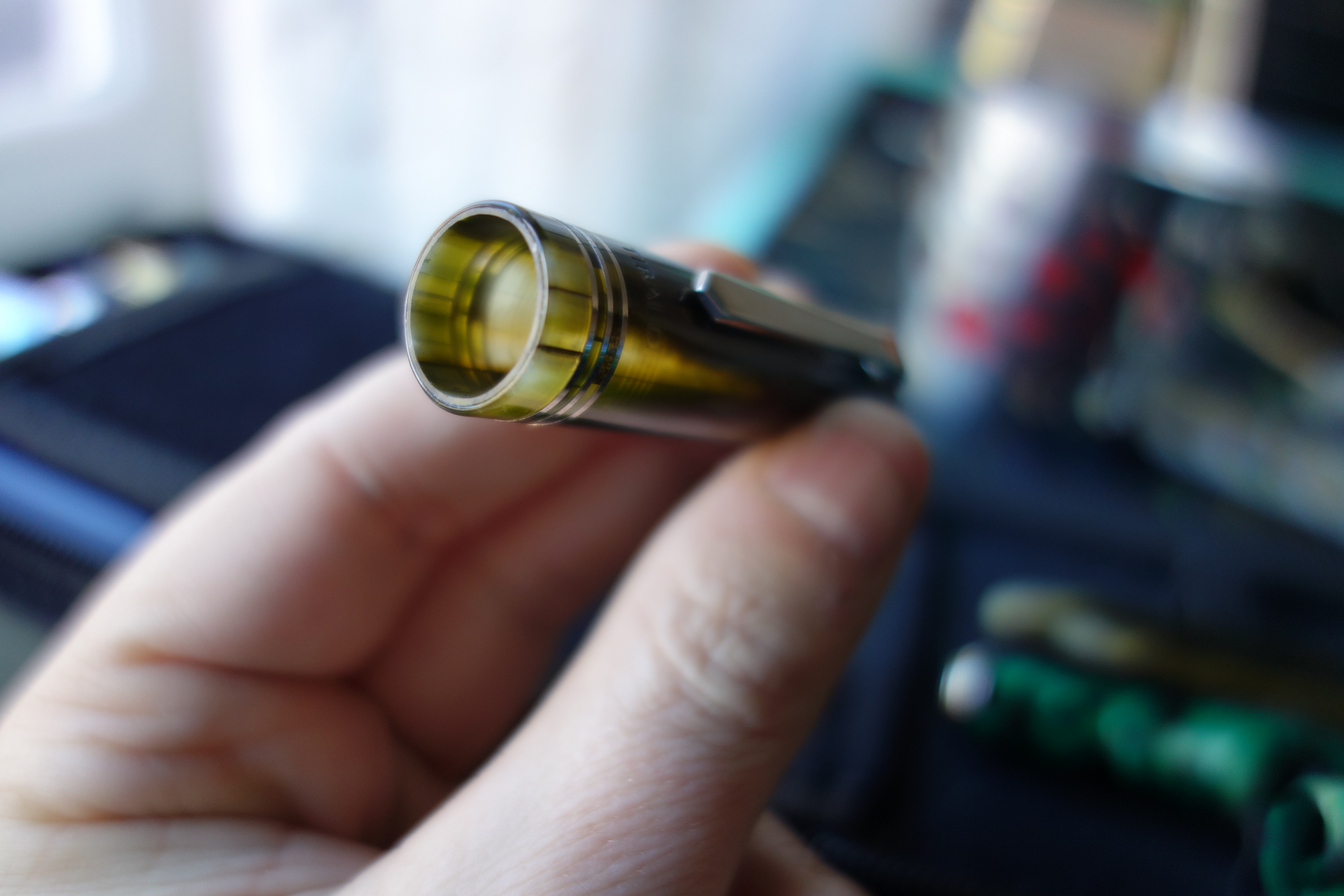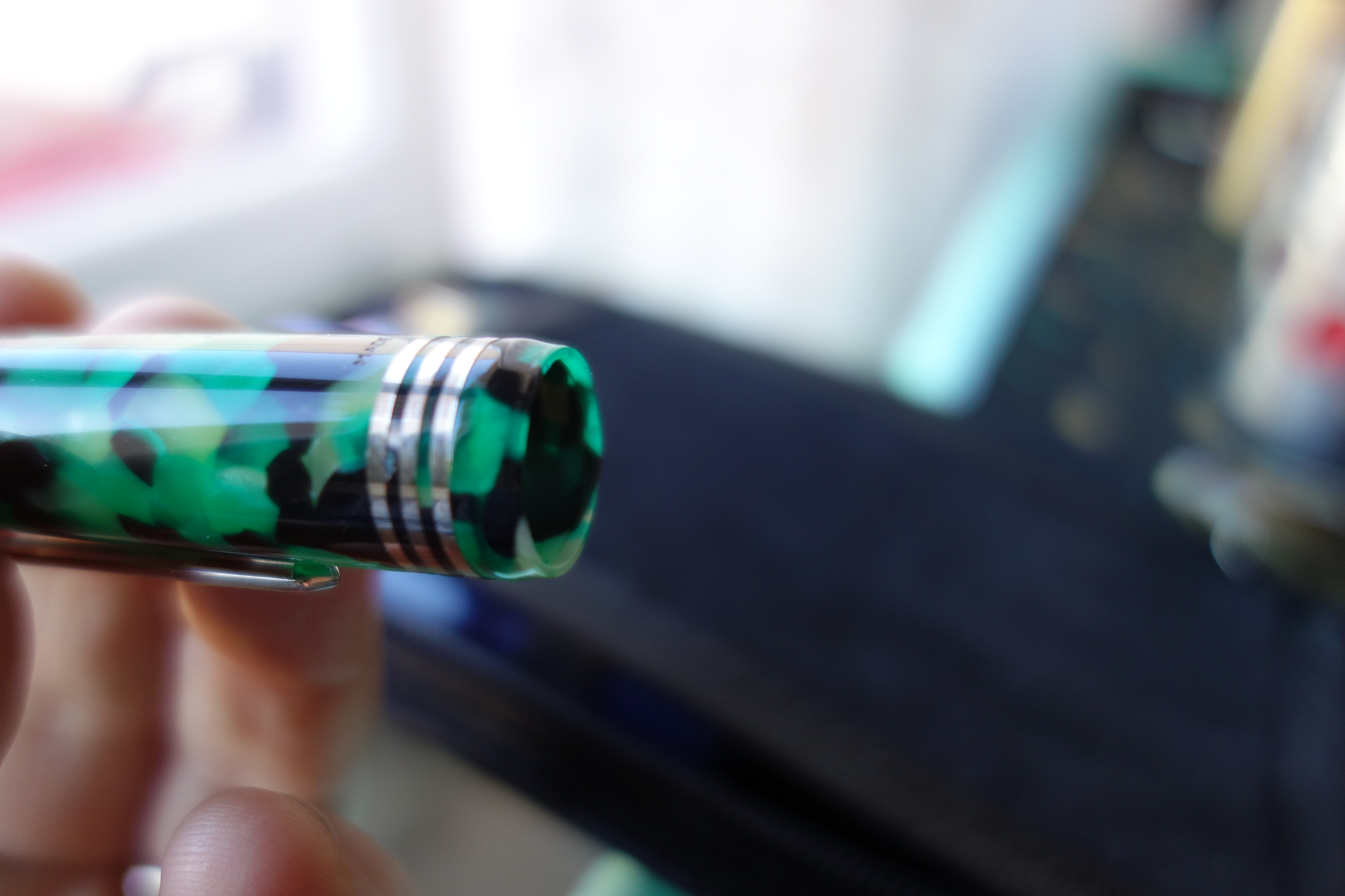 Il peccato commesso da Tibaldi (o Montegrappa?) secondo me, è quello di non aver realizzato cappuccio e fusto dallo stesso segmento di resina, e per metterci su quei 3 anellini hanno fatto uno scempio, asportando il materiale dal cappuccio per realizzare uno scalino per poi infilarci gli anellini e a caso pezzetti di resina, con il risultato di un mosaico di resina spaghetti.