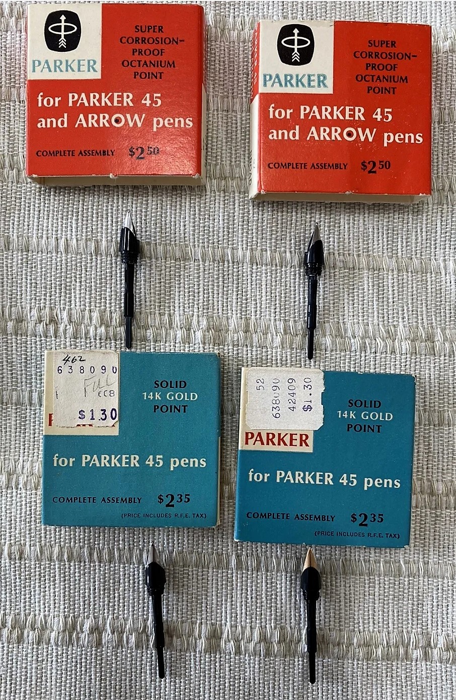 Lo testimoniano le due scatolette rosse nell'immagine che segue, che dichiarano di contenere pennino, collarino e semi alimentatore per "le penne Parker 45 e Arrow".