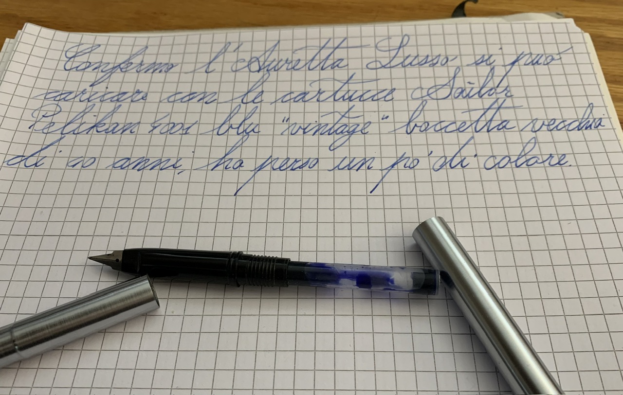 L'Auretta Lusso accetta le cartucce Sailor, ne ho recuperata una vuota , siringato un po' di inchiostro Pelikan 4001 blu da una boccetta vecchia (degli anni '80 !!) e scrive, la cartuccia resta salda in posizione e non perde, neanche se sbatacchiata.
