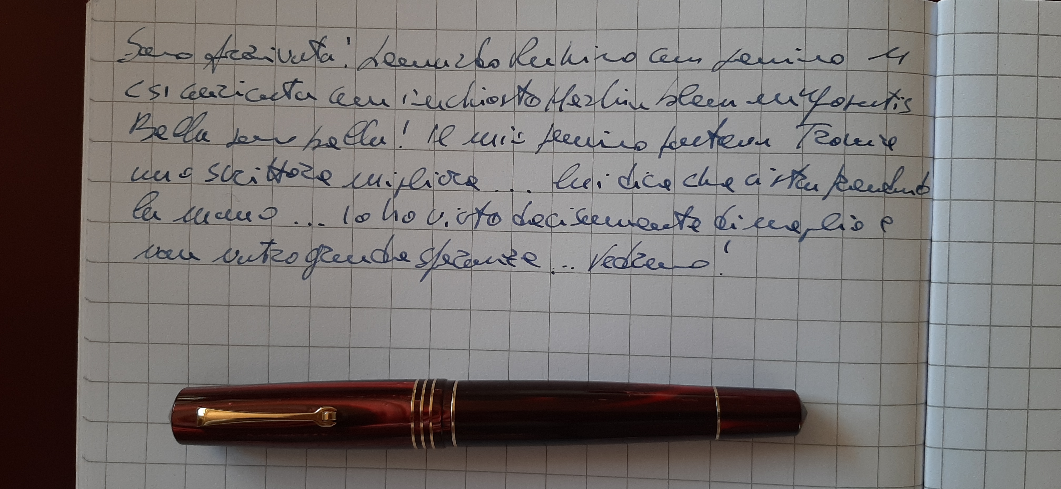 E' arrivata ...con il pennino CSI devo "trovare la mano", mi sembra gradisca posizioni vincolate e tocco leggero ... in confezione anche una boccetta di inchiostro Leonardo red passion ...in internet ho trovato recensione assai poco lusinghiera ( acido simil ferrogallico e sporca le penne) ma voglio caricarlo su di una 'indianina" e provarlo ...qualcuno lo ha utilizzato e puo' dire qualcosa ? Voglio ringraziare il gentile utente che me l'ha ceduta, veramente persona piacevole e corretta, devo dire che i miei contatti avuti sul Forum sono sempre stati positivi e voglio sperare che rimanga una piccola oasi ...