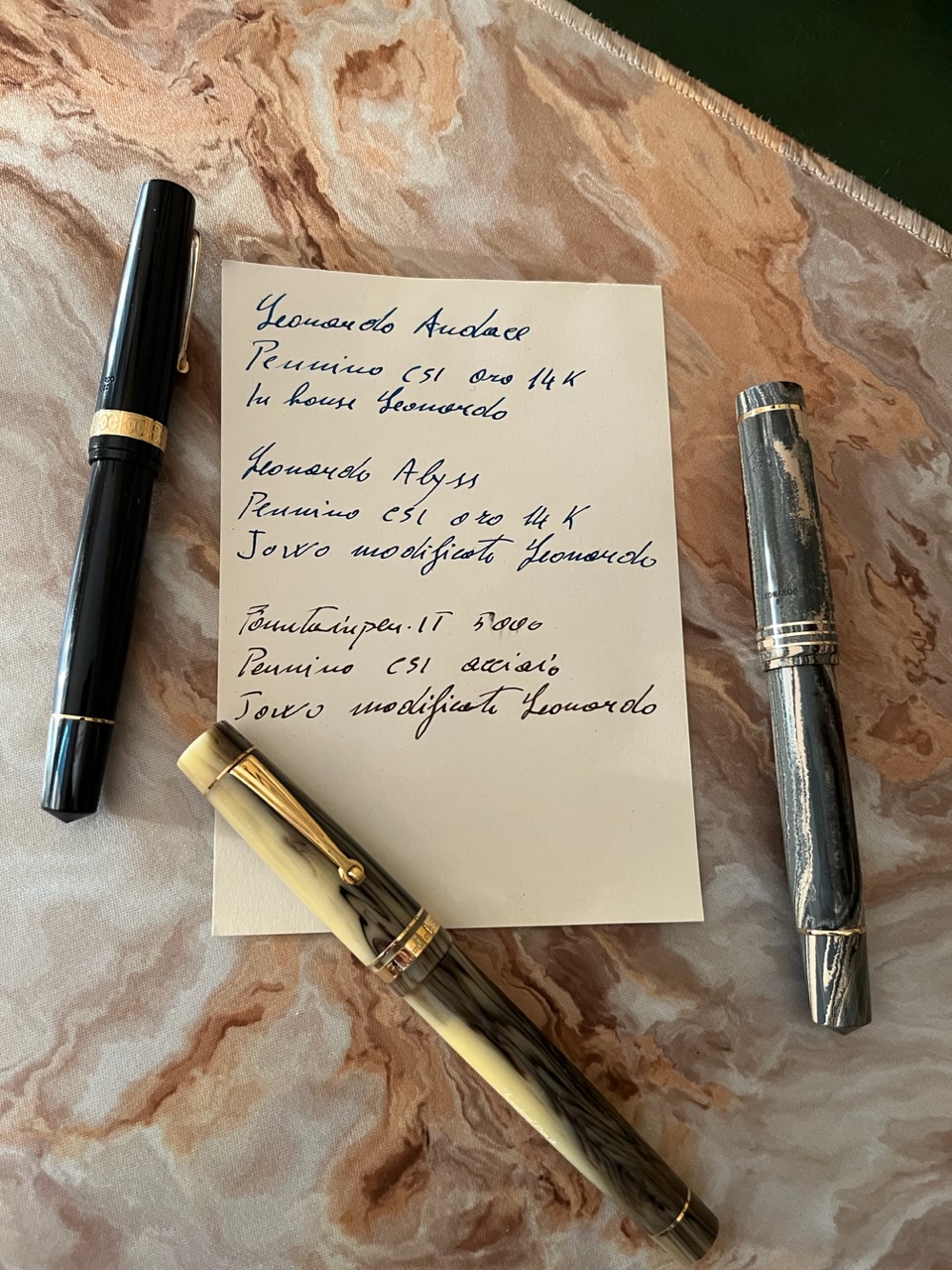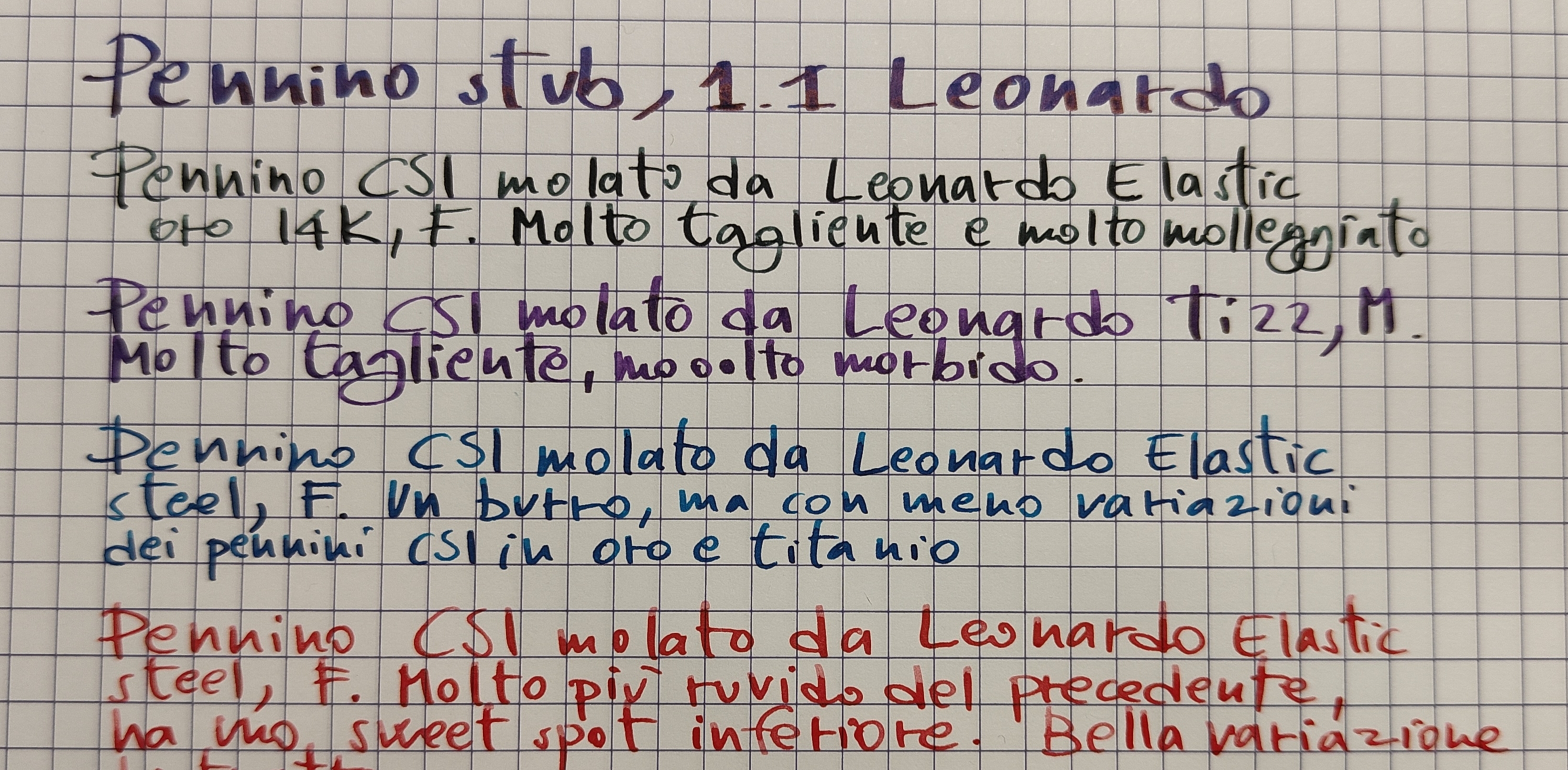 L'utilizzo della Leonardo Rubino e' piacevole, magari il prnnino ( CSI misura M) e' un po' " sibilante" ( cosa che personalmente non apprezzo particolarmente), ma non noto grandi differenze di tratto,, con lo Stub mi sembrano decisamente piu' marcate e che la grafia acquisti maggior carattere. Probabilmente non sono in grado di utilizzarlo correttamente; appena ho modo inserisco una prova di scrittura ...