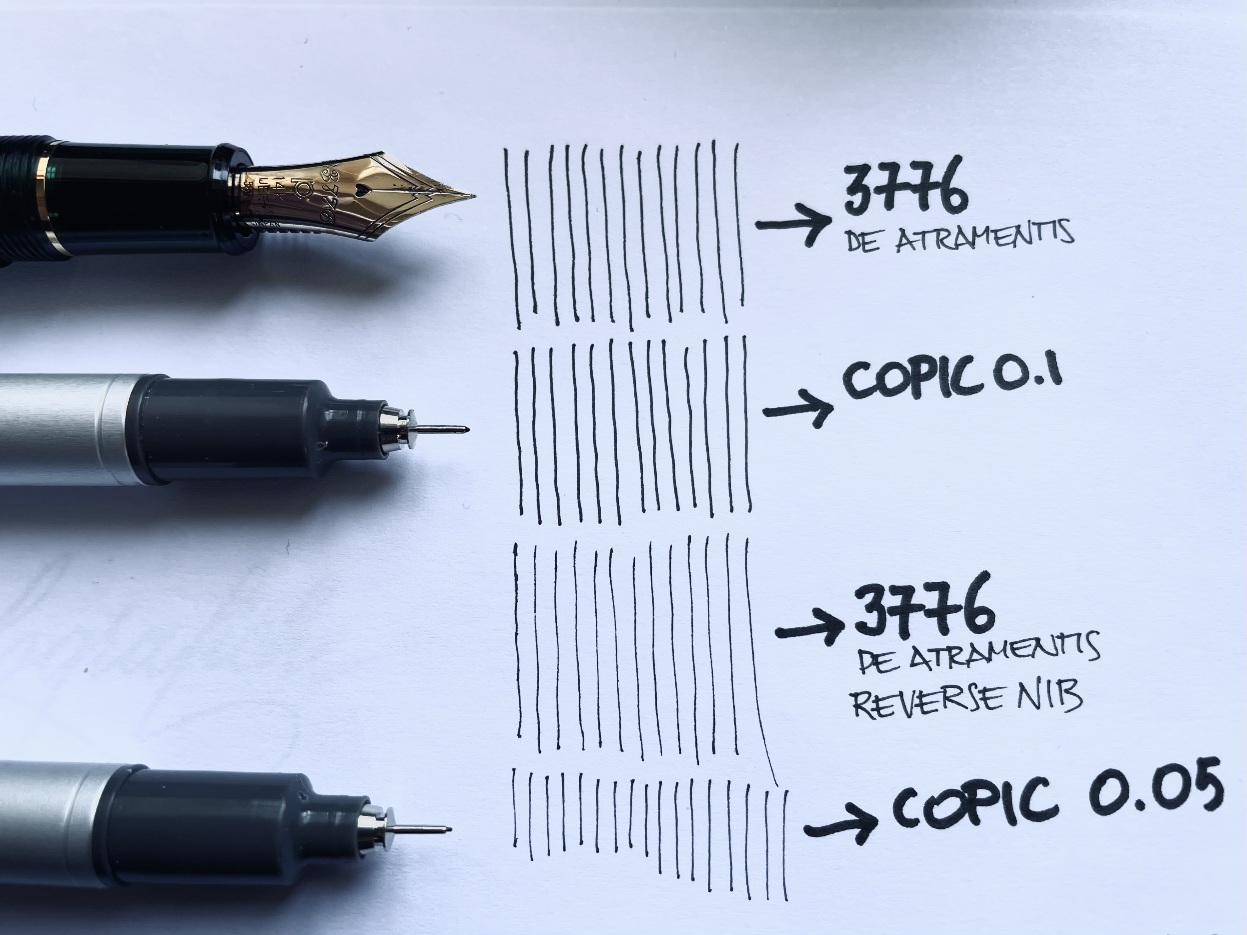 La penna con questo inchiostro ha un tratto paragonabile a un fineliner 0.1, mentre diventa anche 0.05mm in reverse nib.