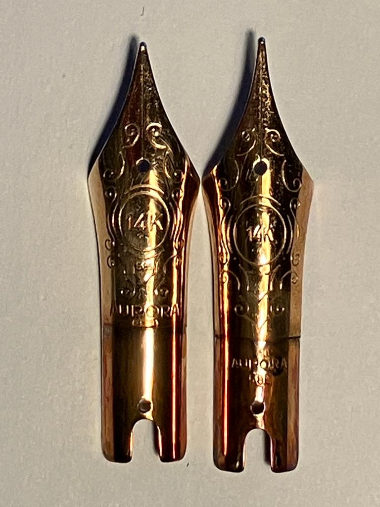 Le tue foto non sono per niente nitide, ma almeno in una c'è il pennino di profilo e li si riesce più a meno a vedere che la punta del pennino è molto schiacciata tipica del extrafine o fine. I pennini aurora medi hanno una punta più sferica o comunque meno piatta di quelli fini o extrafini.