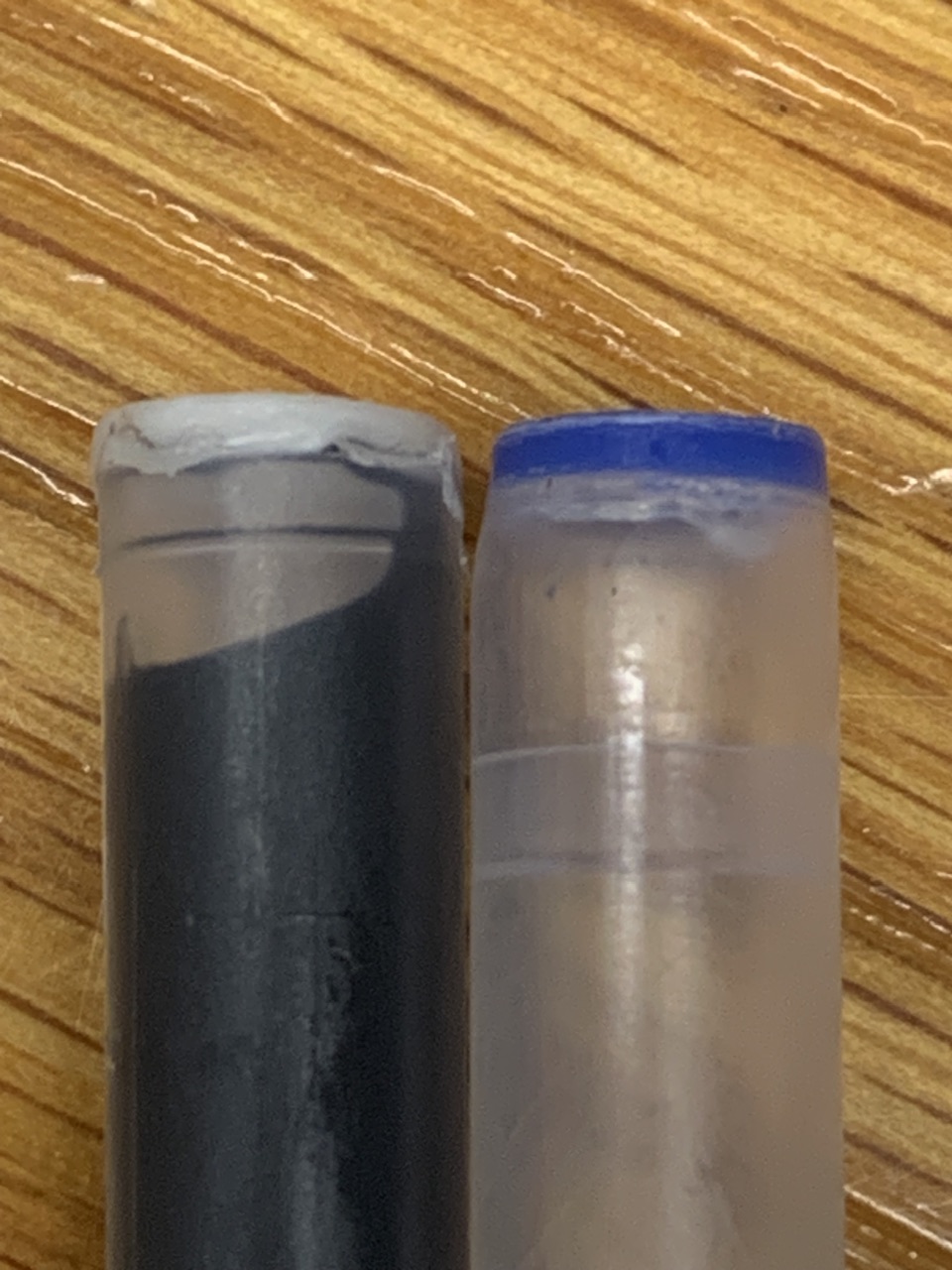 In dettaglio i "culetti" delle cartucce Pelikan (fondello bianco) e Waterman (fondello blu).