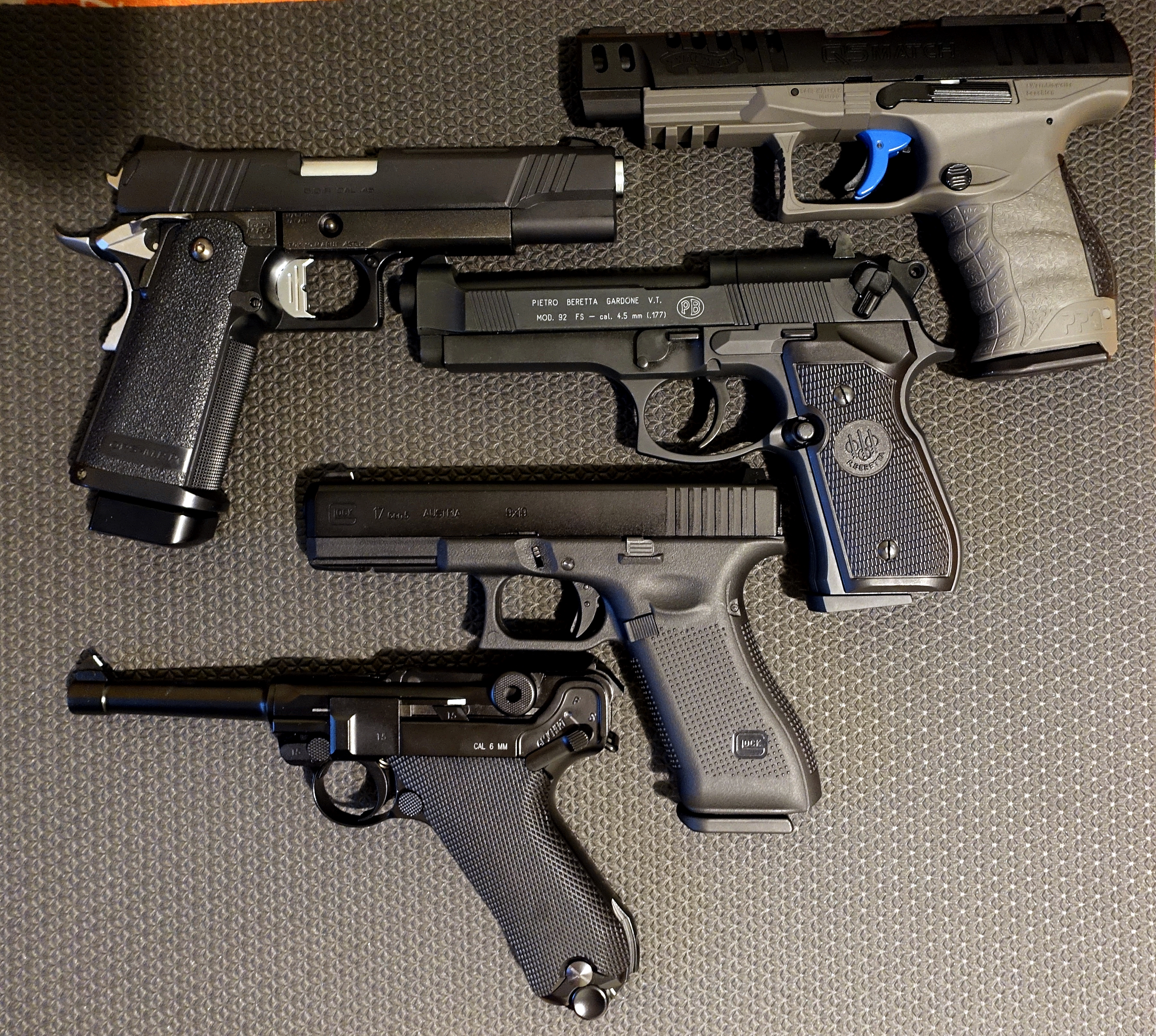 Tokio Marui 45, Glock 17 e Luger P08 sono fosftair, 6mm. pallini in plastica, Greengas, la Luger a Co2.