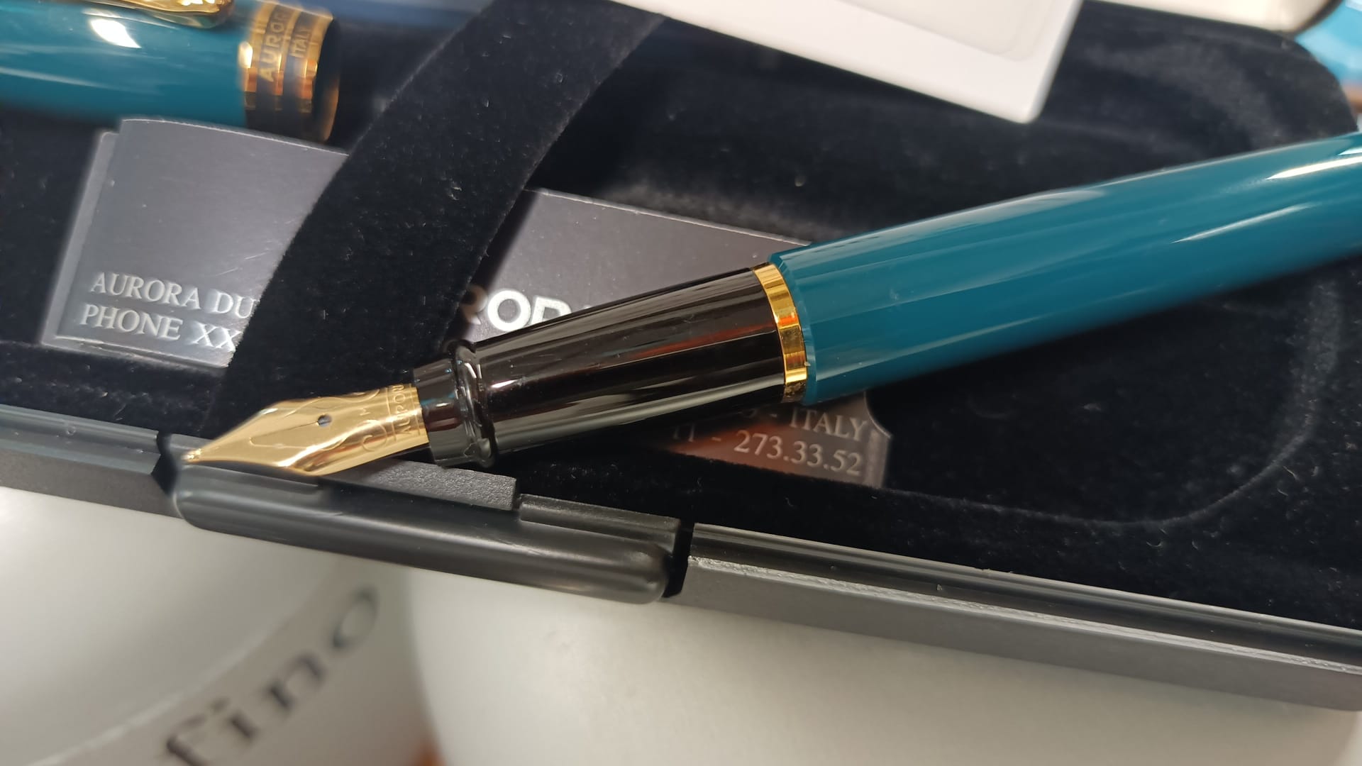 Quella che ho trovato dovrebbe essere degli anni ‘90, perché mi pare uguale a parte il colore a quella che avevo al tempo, comprata nel 1996. Dovrebbe avere il pennino in acciaio. Curioso come sul biglietto interno alla scatola ci sia scritto Aurora Due come nome del produttore. Non ricordavo questo cambio di denominazione sociale. Quasi apro una discussione apposta, perché avevo già una mezza idea di buttar giù una recensioncina