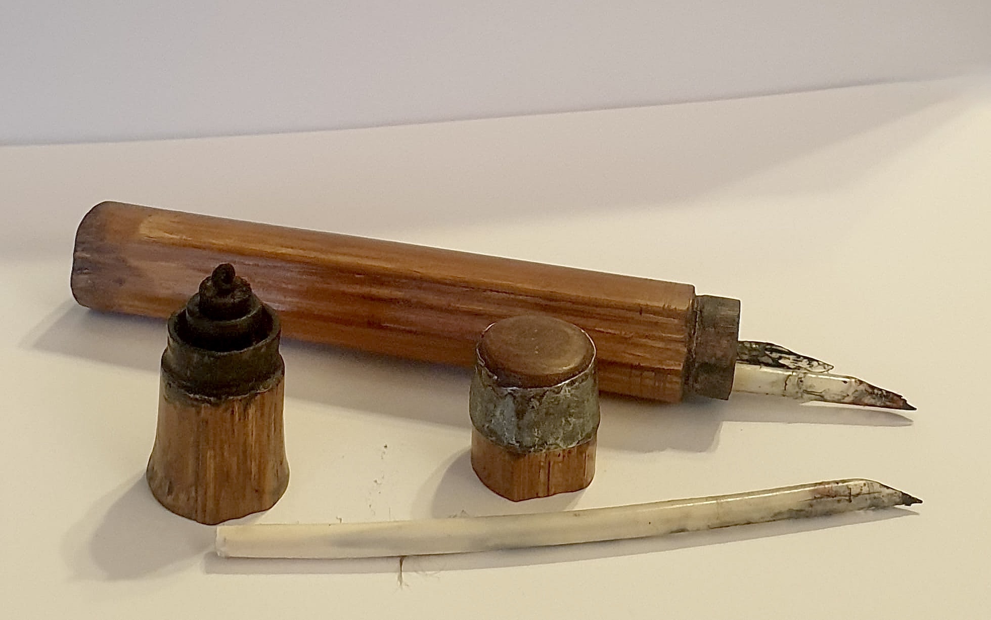Difficile, oserei dire impossibile indicare una datazione. Posso dire solo che è antecedente al pennino di metallo (1830 circa) e che la bottiglietta di vetro era entrata in uso nei penner qualche decina di anni prima.