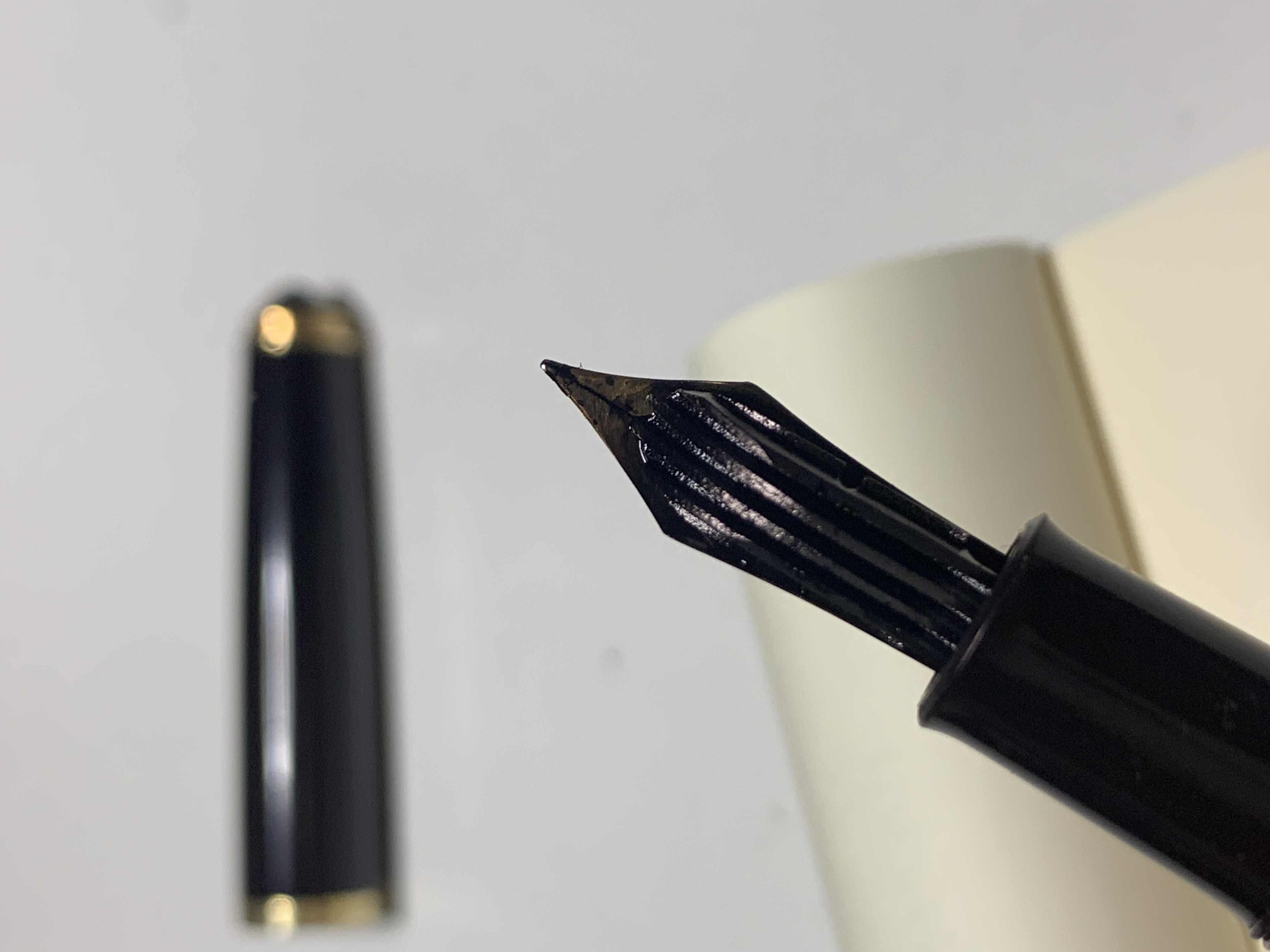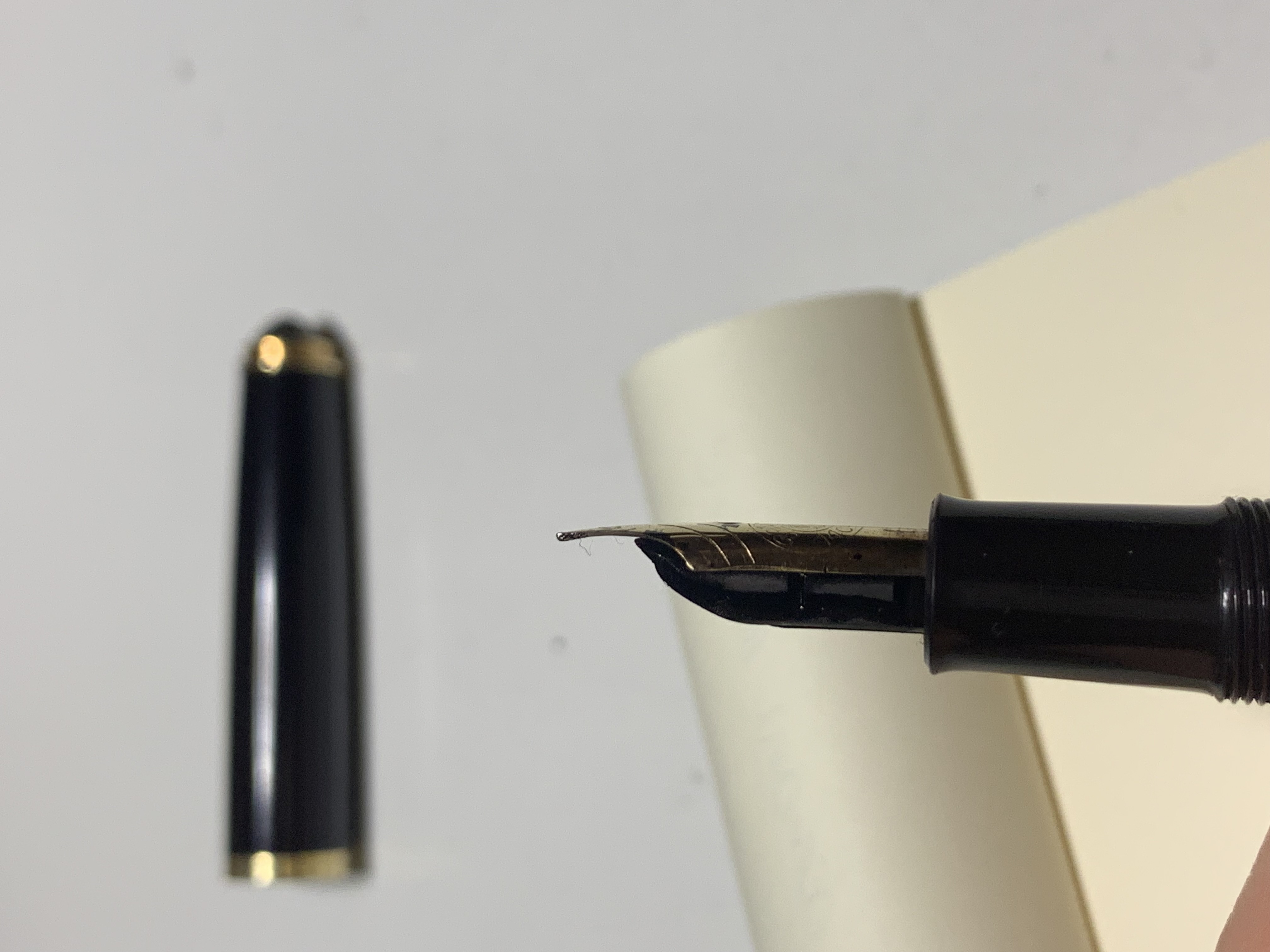 Il pennino della 400NN si svita, come sulle altre Pelikan. Purtroppo non è infrequente che sulle 400NN venisse usato un particolare collarino trasparente che con il tempo diventa fragile e si rompe. Il fatto che il pennino non sia allineato con l'alimentatore mi fa supporre (è un indizio, non una certezza) che il collarino possa essere crepato o rotto, per cui pennino e alimentatore non sono tenuti insieme correttamente. Se il collarino è rotto, e quindi non tiene bene insieme pennino e alimentatore, questo può anche essere la causa del problema della interruzione del flusso di inchiostro (manca la corretta capillarità che fa affluire inchiostro al pennino).