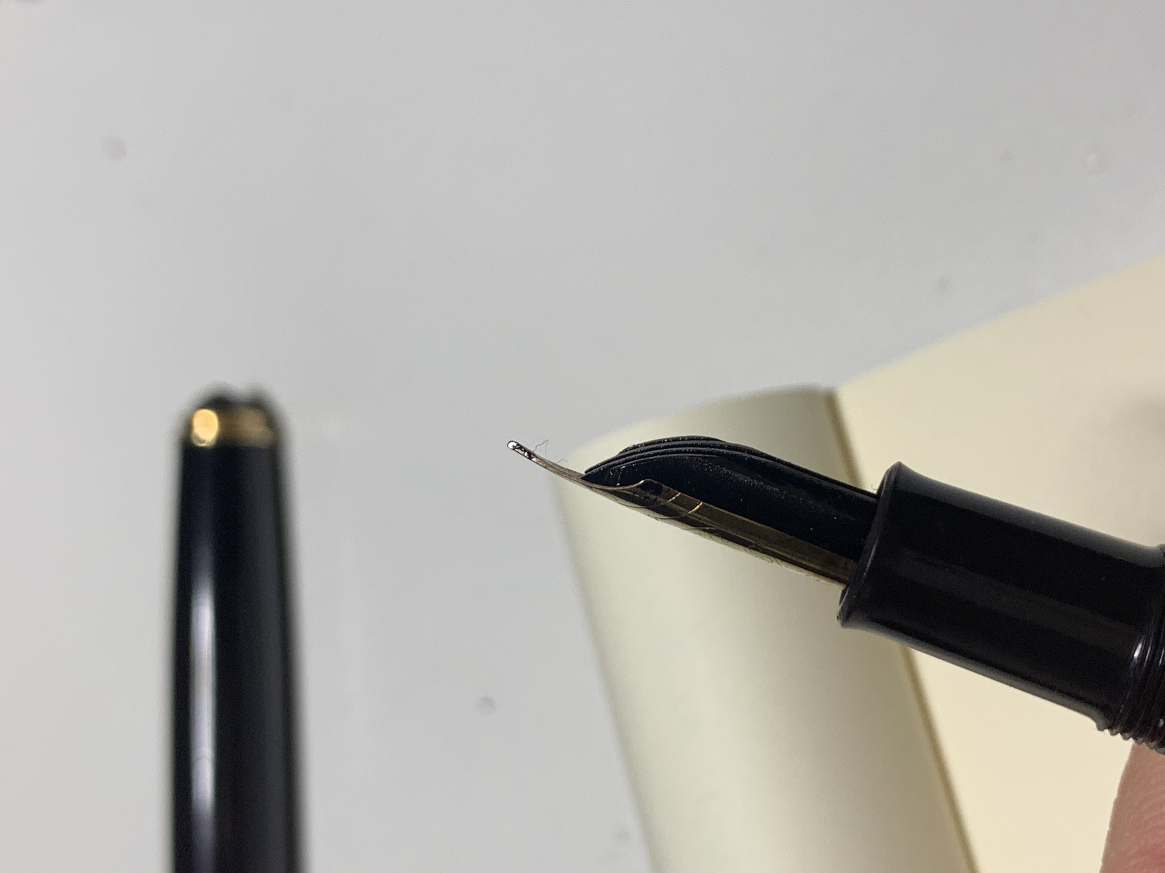 Forse sarà un effetto di prospettiva o altro, però a me non pare che pennino e alimentatore siano ben accoppiati assieme, in particolare sembrerebbe che l'ala destra sia un poco alzata o che abbia una curvatura strana (curva rossa), oppure l'alimentatore un poco storto o non in asse con il pennino. Inoltre proprio dalla parte destra sembrerebbe esserci troppa distanza tra pennino e alimentatore (freccia rossa).