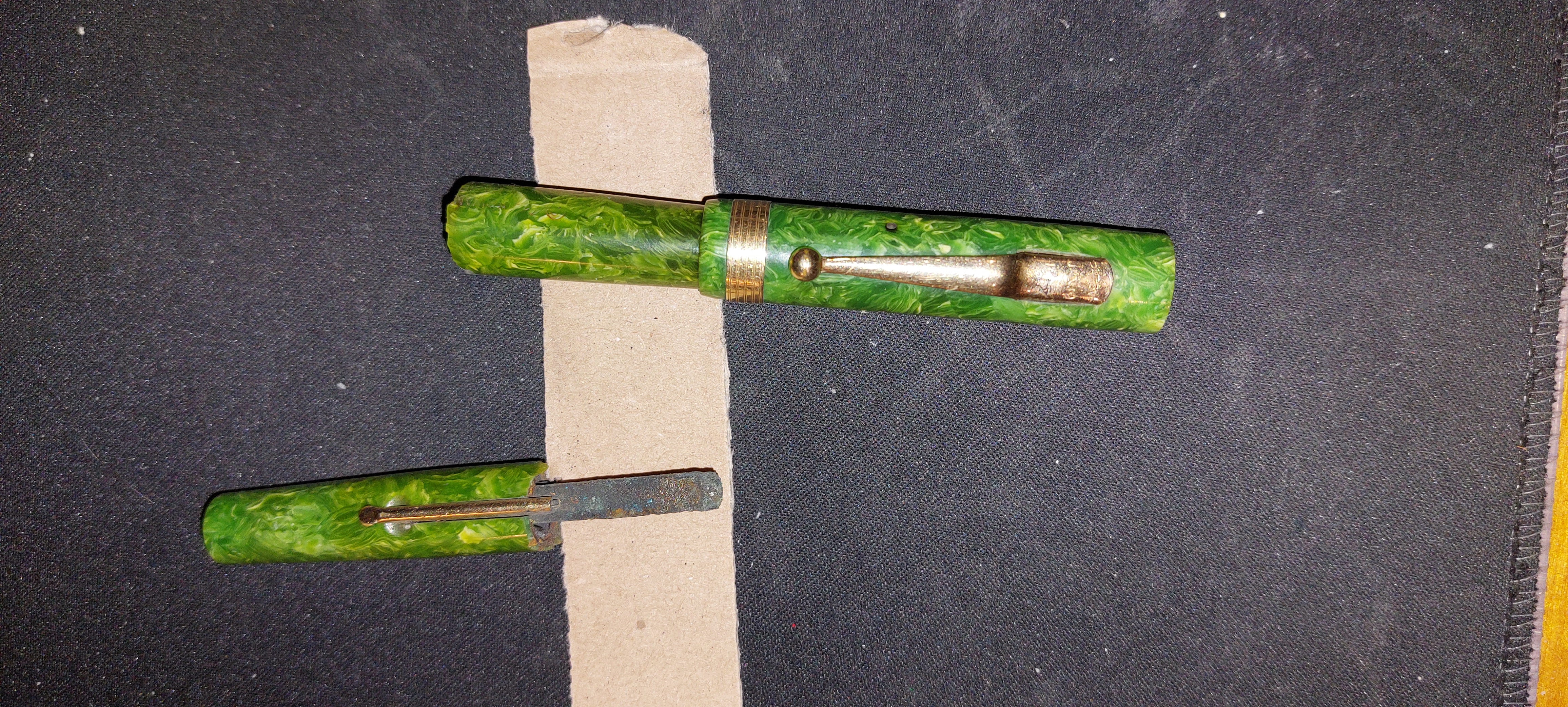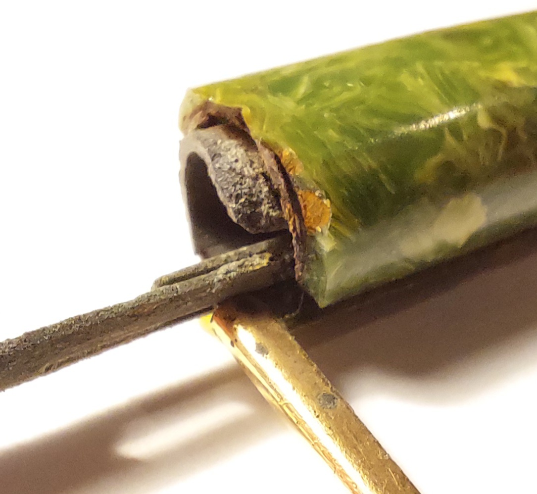 Del resto la ruggine sulle barre è comune anche in penne non in celluloide, e la zona dell'anellino è un punto di fragilità (minore spessore, ruggine che si gonfia).