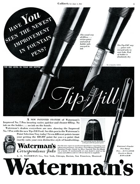 Nel giugno del 1933 lo splendido calamaio fece il suo debutto “ufficiale” su una rivista generalista a diffusione nazionale, contribuendo con le sue forme moderne ed eleganti a rafforzare le idee di progresso veicolate dal messaggio della Casa che lanciava il nuovissimo alimentatore “Tip-Fill” per la ricarica “pulita” (https://www.fountainpen.it/Tip-Fill), WATERMAN - 1933.06 – Improved No. 7 Pen with Tip-Fill Feed & Correspondence Inks - Collier's magazine - pag.3 (mio conferimento al Wiki)