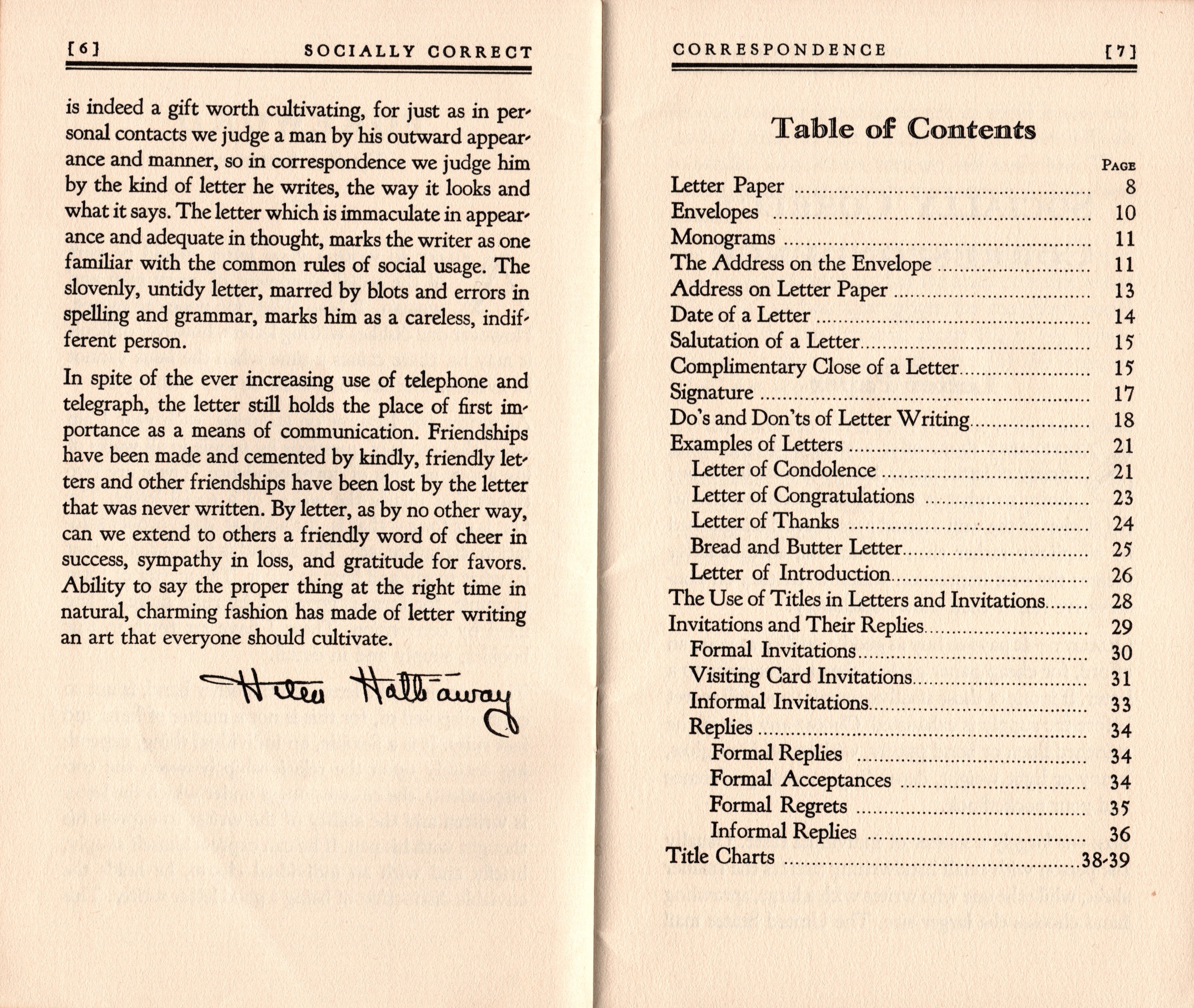 un pamphlet/trattatello/libretto sulla corretta forma da adottare nella “corrispondenza sociale” (dunque sia lettere che biglietti), tanto privata quanto lavorativa, così come si trovava codificata dall’uso e dalle convenzioni negli Stati Uniti del 1929. Pubblicato in proprio dalla L.E. Waterman Company di New York, N.Y., l’opera era stata commissionata dalla Casa alla riconosciuta esperta di etichetta e buone maniere Helen… “qualchecosa”