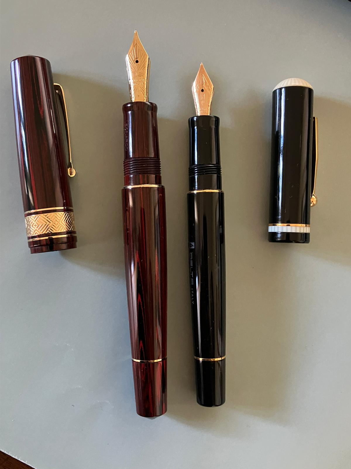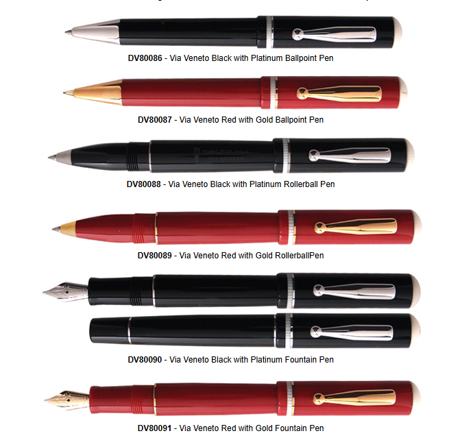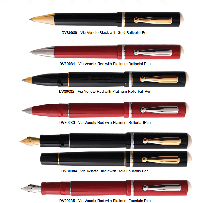 La penna era disponibile, come dicevo, in resina nera o rossa, e come da frequente consuetudine Delta, in finitura sia oro che rodiata.