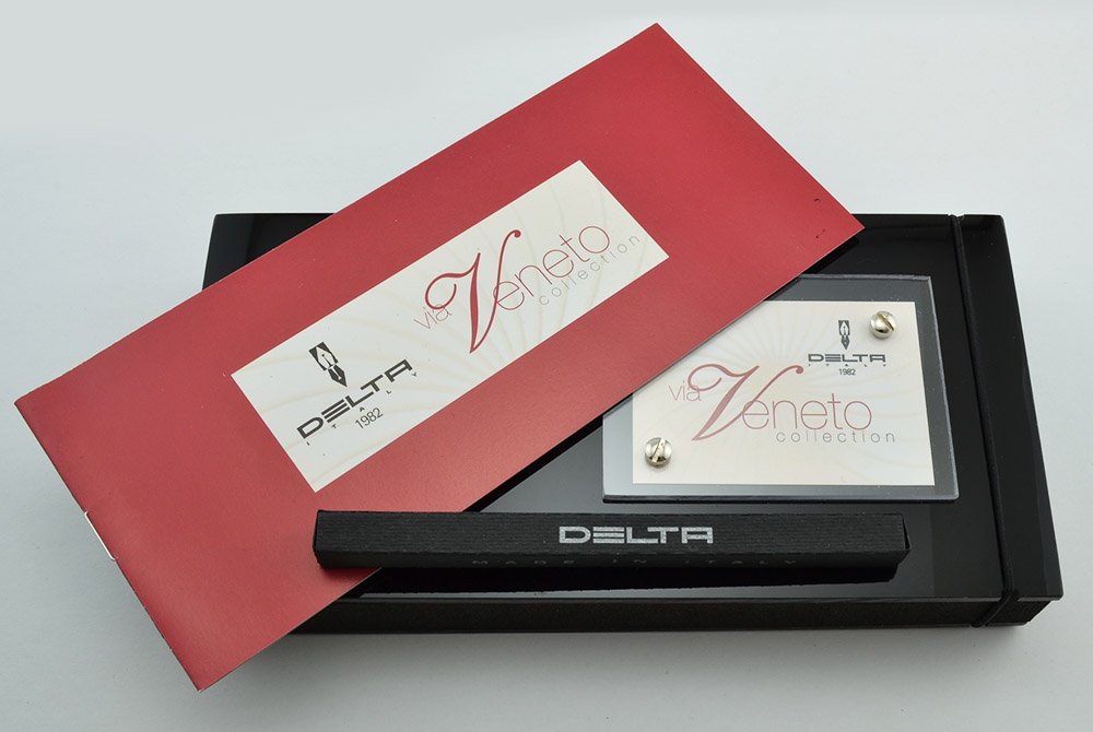 La penna veniva originariamente venduta in una di quelle confezioni abbastanza originali e per allora innovative, di Delta, formate da un contenitore in schiuma rigida e una coperchio in plexiglas nero rotante su un perno. La penna era annegata nel contenitore in schiuma che la tratteneva agli estremi. Un elastico poi bloccava il coperchio in posizione.
