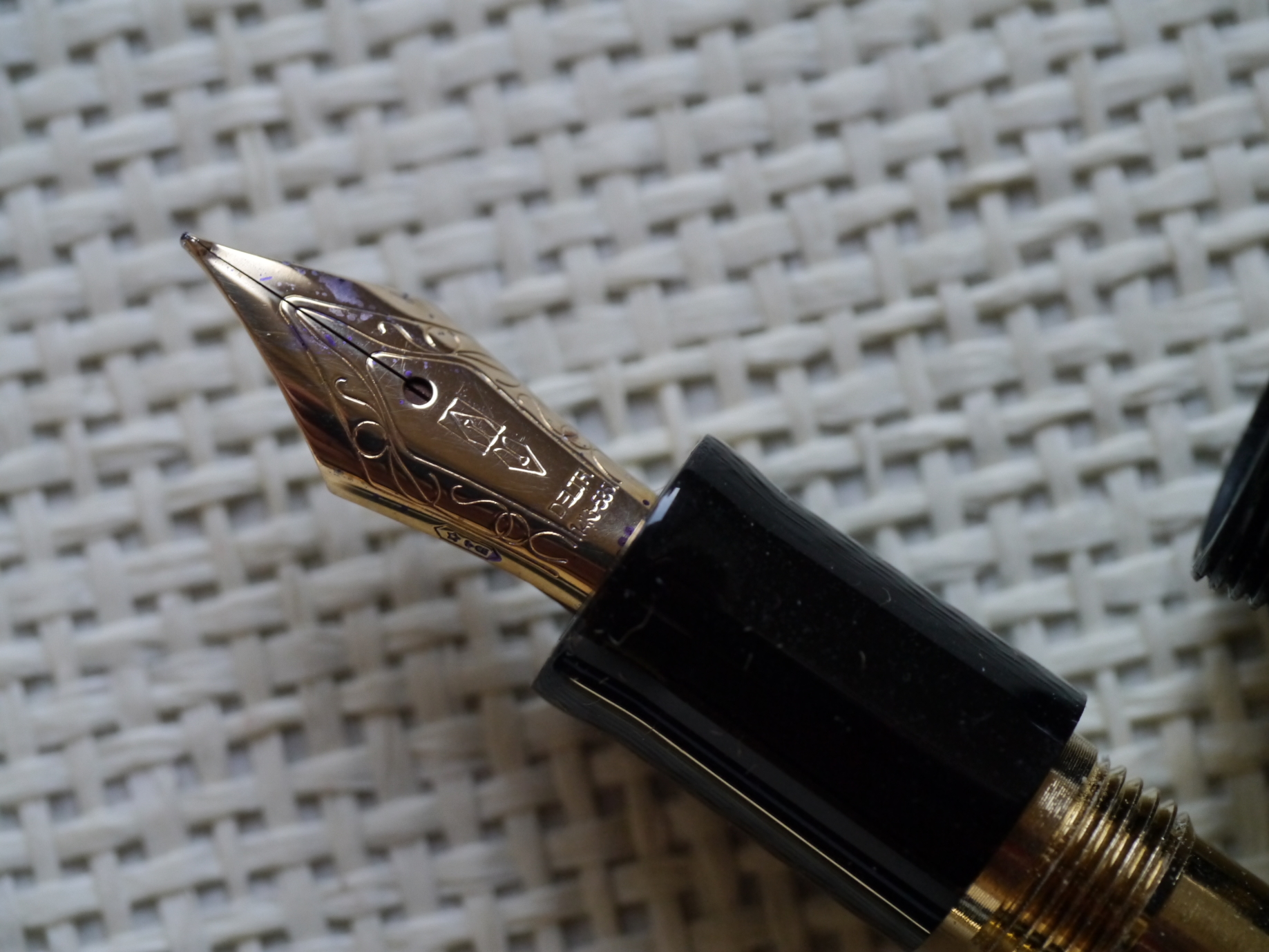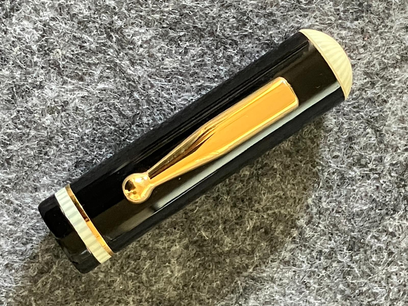 Era prodotto da Bock per Delta (e quindi marchiato Delta), e nello specifico è un 076, lo si riconosce da quella forma con le ali molto allargate in confronto alla sua lunghezza (lo 076 è stato usato con frequenza da Delta sulle sue penne più piccole, della serie Dolce Vita, come le Slim, ma anche sulla We', sulla Black& White, sulla Passion. Lo si trova con frequenza, ovviamente marcato ad hoc, anche su diverse Visconti.)