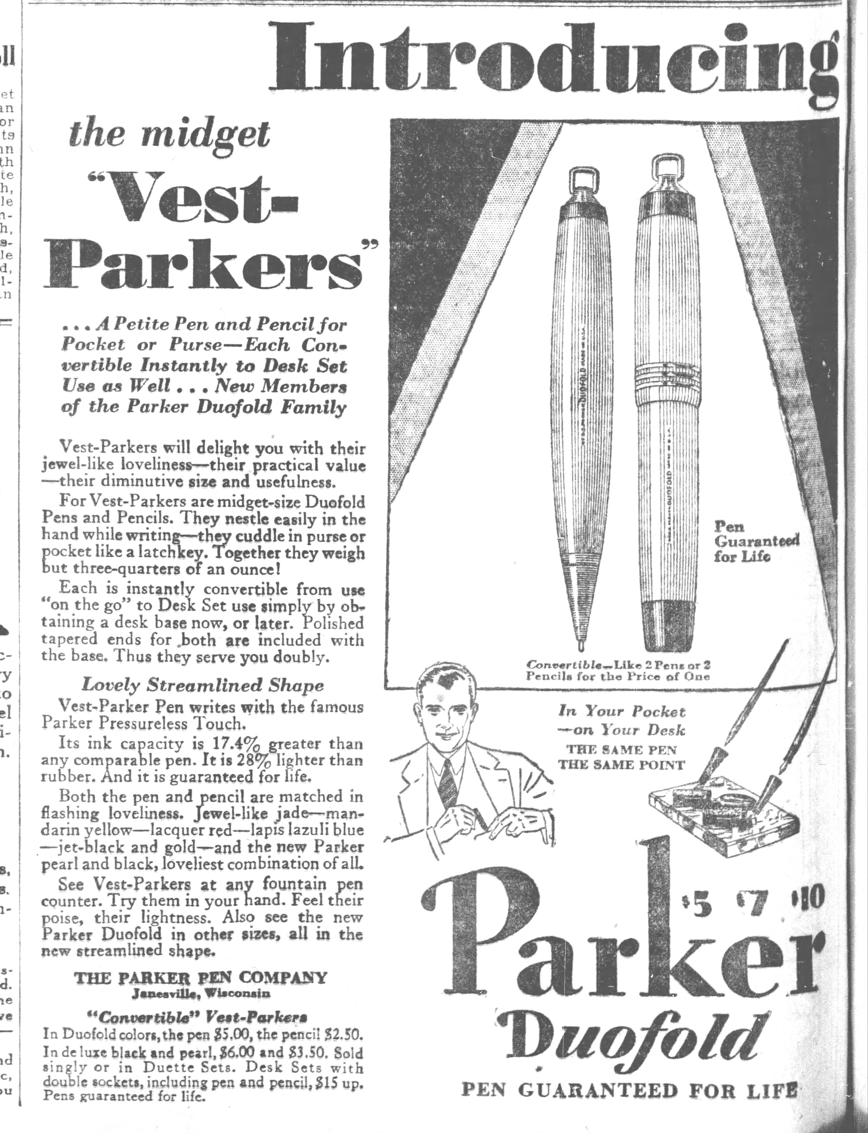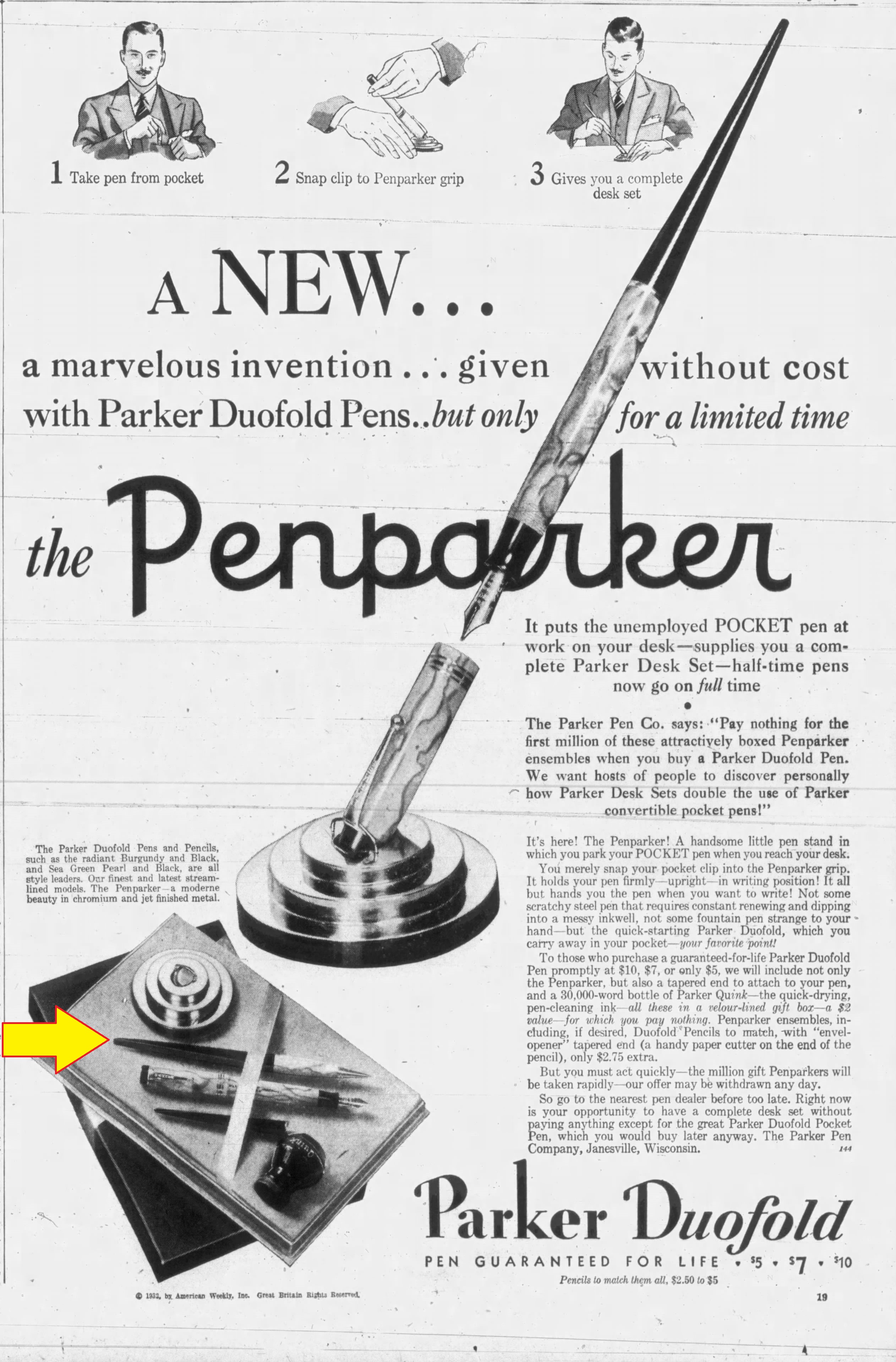 Nel citato sito parkersheaffer.com, l’ottimo Dan Zazove firma un articolo che introduce dal punto di vista storico il «Penparker» (https://parkersheaffer.com/penparker-a- ... desk-base/) ricordando come proprio nel 1932, al culmine degli effetti negativi della Grande Depressione, la Parker avrebbe visto il proprio fatturato ridursi ad un terzo rispetto a quello degli anni precedenti (!), e che avrebbe patito per la prima volta nella sua quarantennale storia il primo esercizio in perdita… La risposta della dirigenza, in attesa del lancio del nuovo prodotto che avrebbe rivoluzionato il mercato (la prima Vacuum-filler/Vacumatic trasparente è proprio dell’autunno di quell’anno), fu quella di prendere tempo, resistere senza abbassare i prezzi, e cercare di smaltire gli stock di Duofold invenduti, proponendo con campagne pubblicitarie di grande impatto le penne e le matite in abbinamento ad accessori utili ma con bassissimi costi di produzione.
