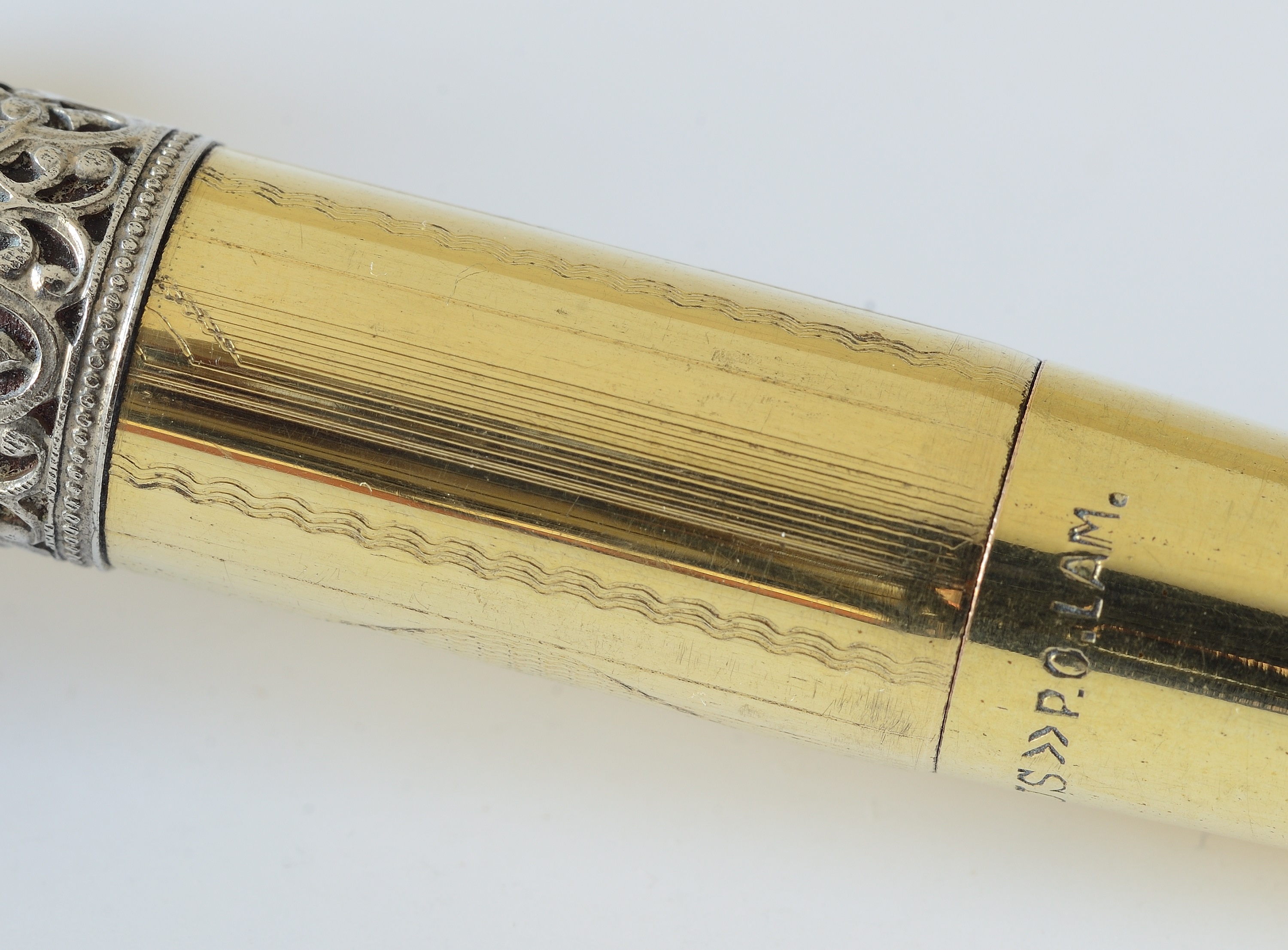 La Ma.Gus è una rientrante laminata oro con due fasce in filigrana d'argento trovata in parure con la sua matita, fine anni 20 credo, purtroppo senza scatola e con pennino non suo in oro 14K, porta le sole scritte su tre righe ORO - 585 in un rombo e Extra.