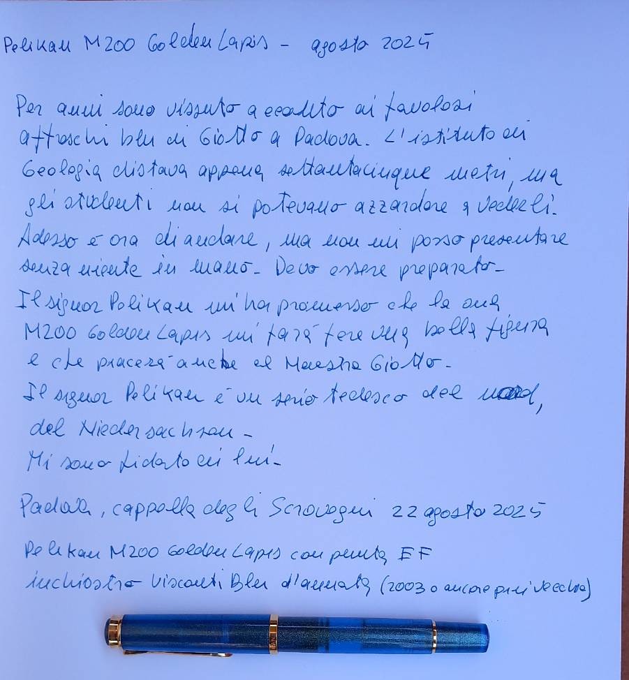 Il signor Pelikan mi ha promesso che la sua M200 Golden Lapis mi farà fare una bella figura e che piacerà anche al Maestro Giotto. Il signor Pelikan è un serio tedesco del nord, del Niedersachsen. Mi sono fidato di lui.