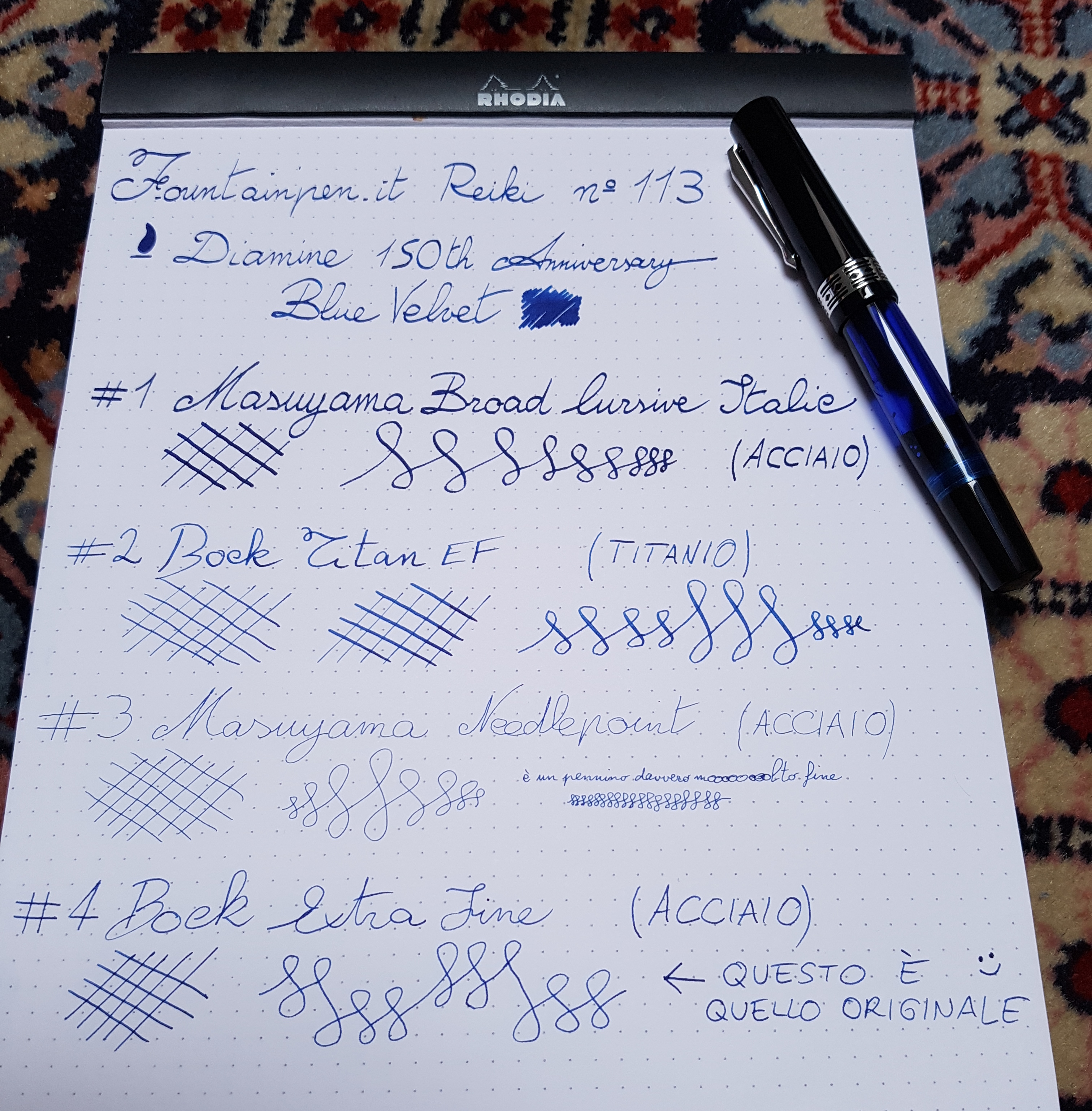 Teoricamente avrei dovuto aspettare l'arrivo del fusto di ricambio prima di iniziare ad usare la penna. Teoricamente. In realtà dopo ormai più di due mesi non ho resistito, ed oggi che mi sono concesso un po' di (meritato) riposo, ho caricato la mia Reiki. Premetto che non ho avuto alcun problema a riempire la penna, utilizzando lo stesso metodo a colpi brevi ma decisi che adopero per caricare il converter Pilot CON-70. Però, visto che una semplice prova di scrittura dopo due mesi mi sembrava poco, ho sfruttato il fatto di avere molte meno penne cariche in questo periodo, facendo razzia di tutti i miei pennini Bock #6 e provandoli nella Reiki