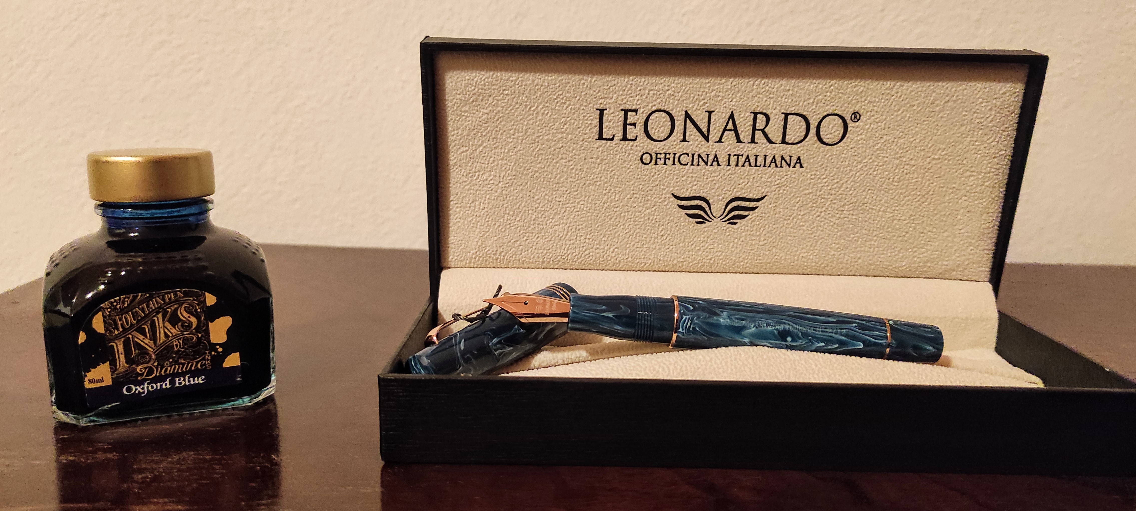 Una bella Leonardo Momento Zero Blu Positano con pennino in acciaio e finiture Rose Gold abbinata ad un inchiostri Diamine Oxford Blue.