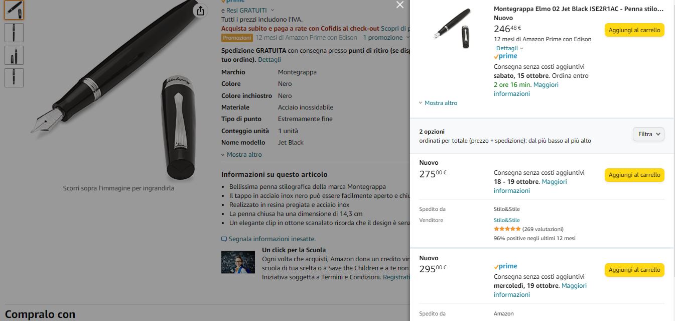Qui a 170levodi ha scritto: ↑giovedì 13 ottobre 2022, 21:49Come vedi in questo momento per questa inserzione ci sono 3 venditori con prezzi diversi, una volta esaurite quelle a 246,48€, cliccando sullo stesso link troverai quelle a 295novainvicta ha scritto: ↑giovedì 13 ottobre 2022, 21:03 https://www.amazon.it/Montegrappa-stilo ... 115&sr=8-3
