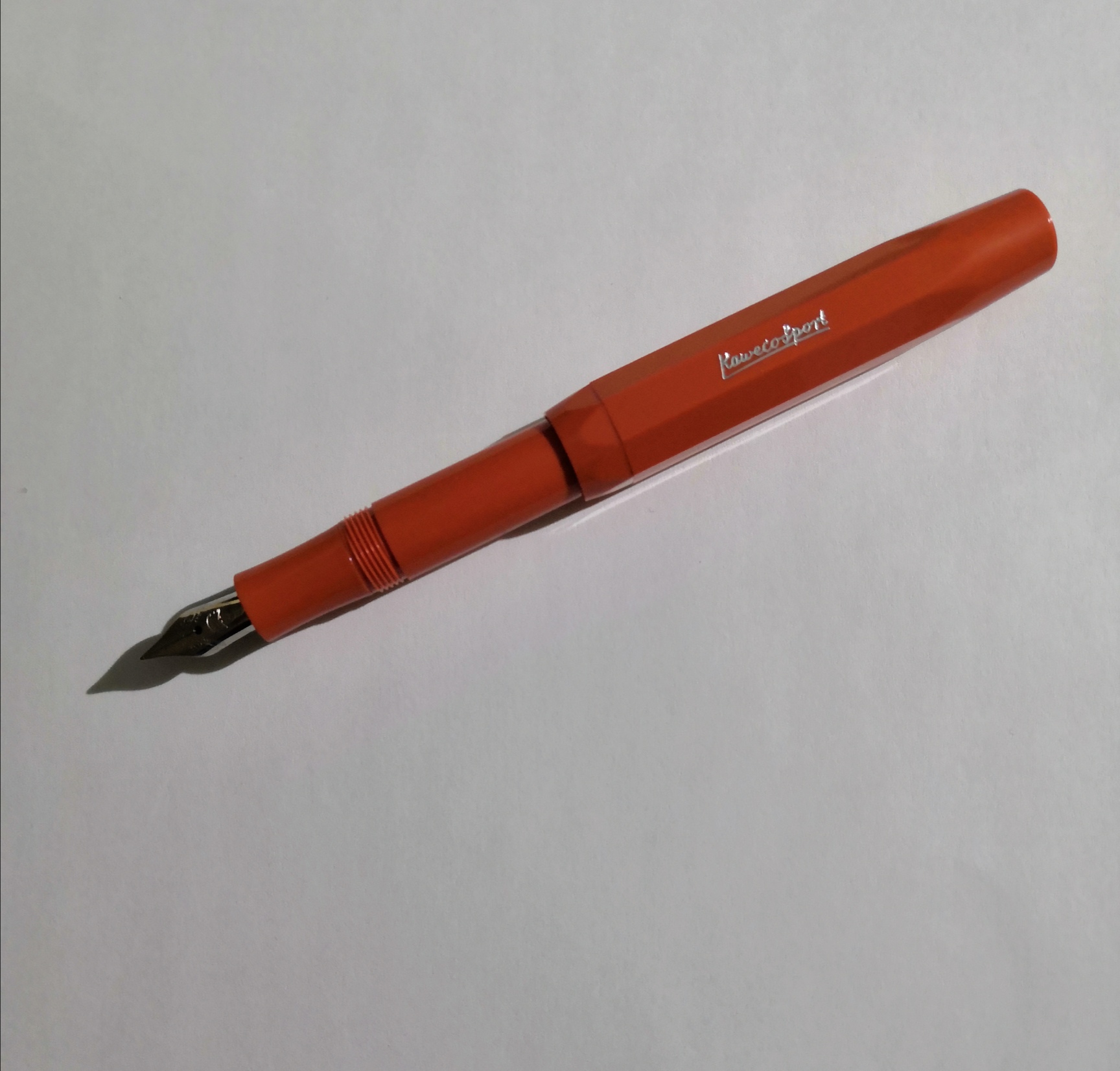 Eccolo il mio ultimo acquisto. Una simpaticissima Kaweco Sport Skylyne, nel colore che chiamano Fox, un arancio mattone. Finiture cromate e pennino extrafine da alternare con l'unico Broad che ho. Poi vi faccio sapere come va l'extrafine, visto che se ne parlava in una discussione.