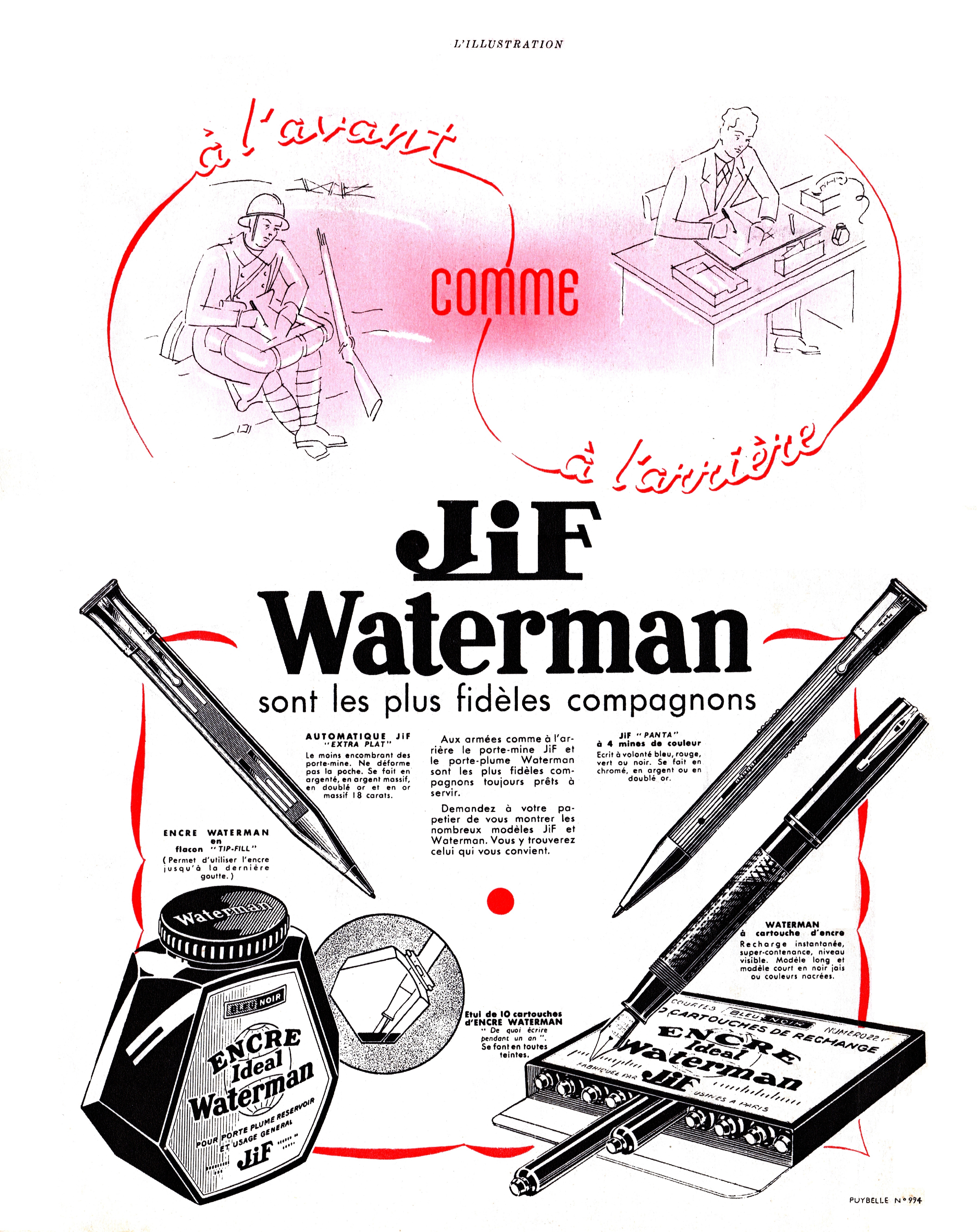 Sull’ultima pagina di copertina della rivista, campeggia un’enorme Ad della Jif-Waterman, ovviamente programmata in precedenza, quando ancora la guerra sul fronte occidentale era una “strana guerra”, di attesa e di posizione, come ben evidenzia il soldato, trincerato ed intento a scrivere...