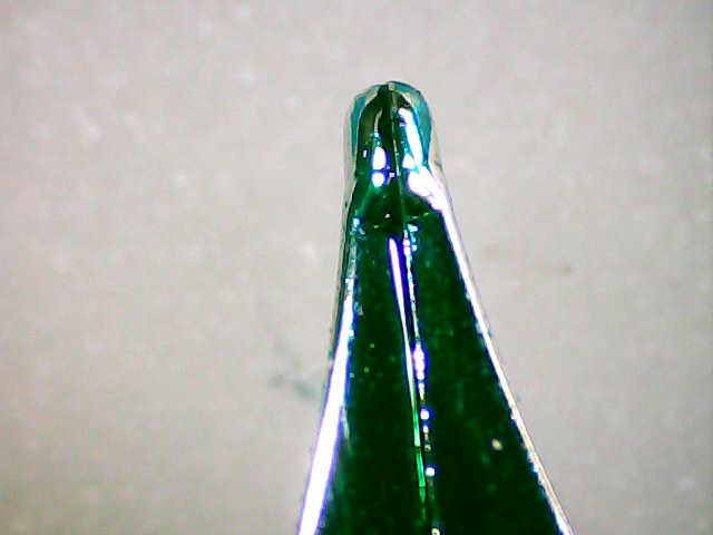 Che il taglio sia asimmetrico mi pare evidente (in realtà sono i rebbi ad esserlo, ma tant’è). Credo che questo esemplare possa tranquillamente essere inviato per la sostituzione del pennino, sperando che i ritardatari (me compreso) possano giovarsi di una maggiore attenzione a questi particolari in fase di montaggio, prima che la penna venga spedita all’utente finale.