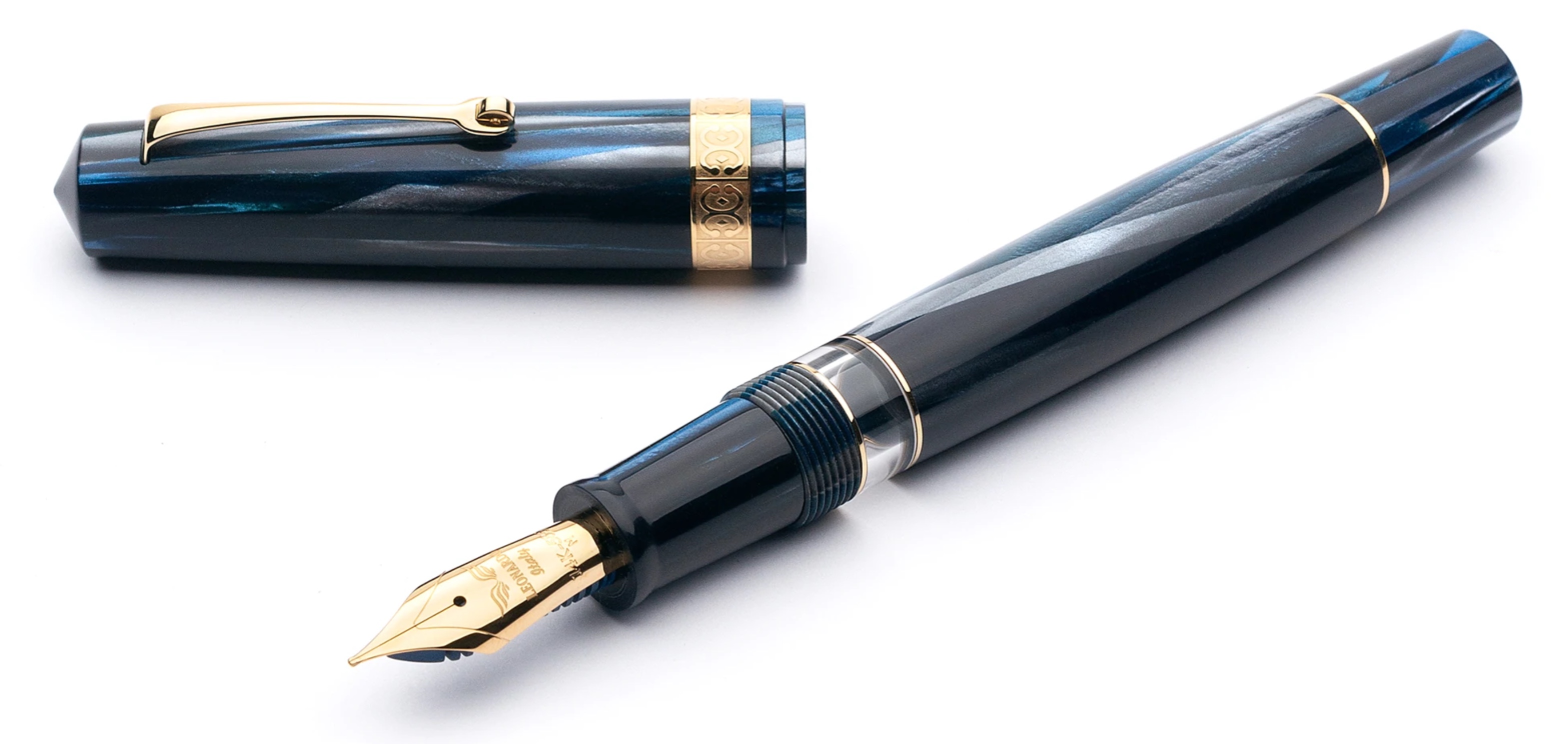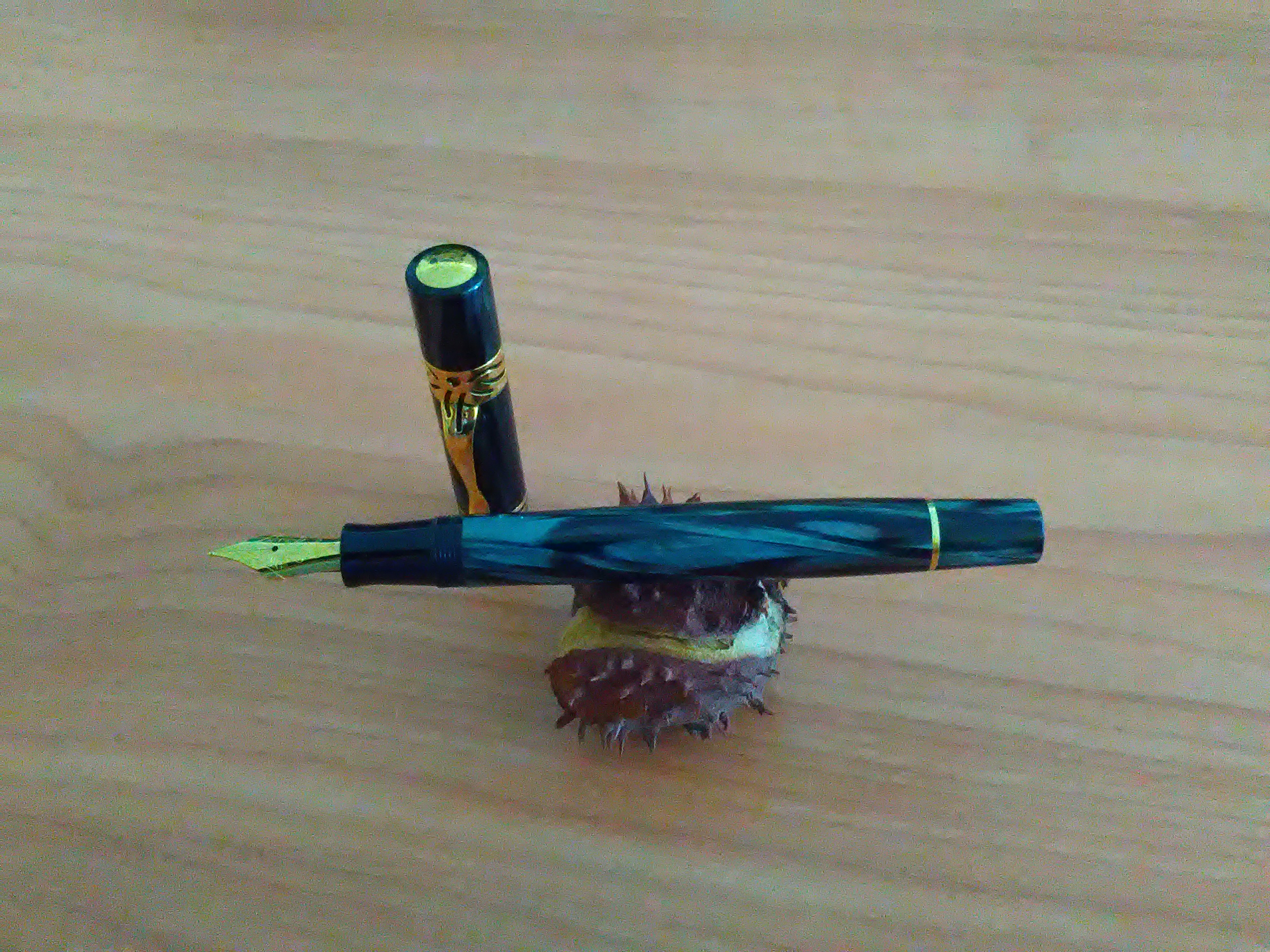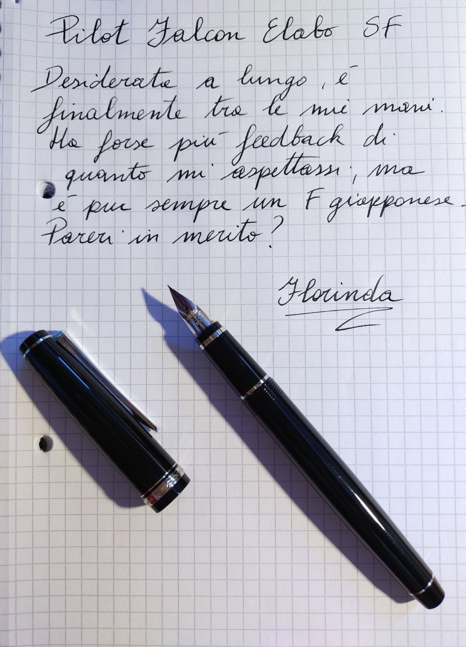 Penna golosissima, con un pennino unico (almeno esteticamente, probabilmente anche a livello di uso). Se è come la Justus, tenderà ad ammorbidirsi ulteriormente con l’uso, non so quanto l’abbia rodata geko.