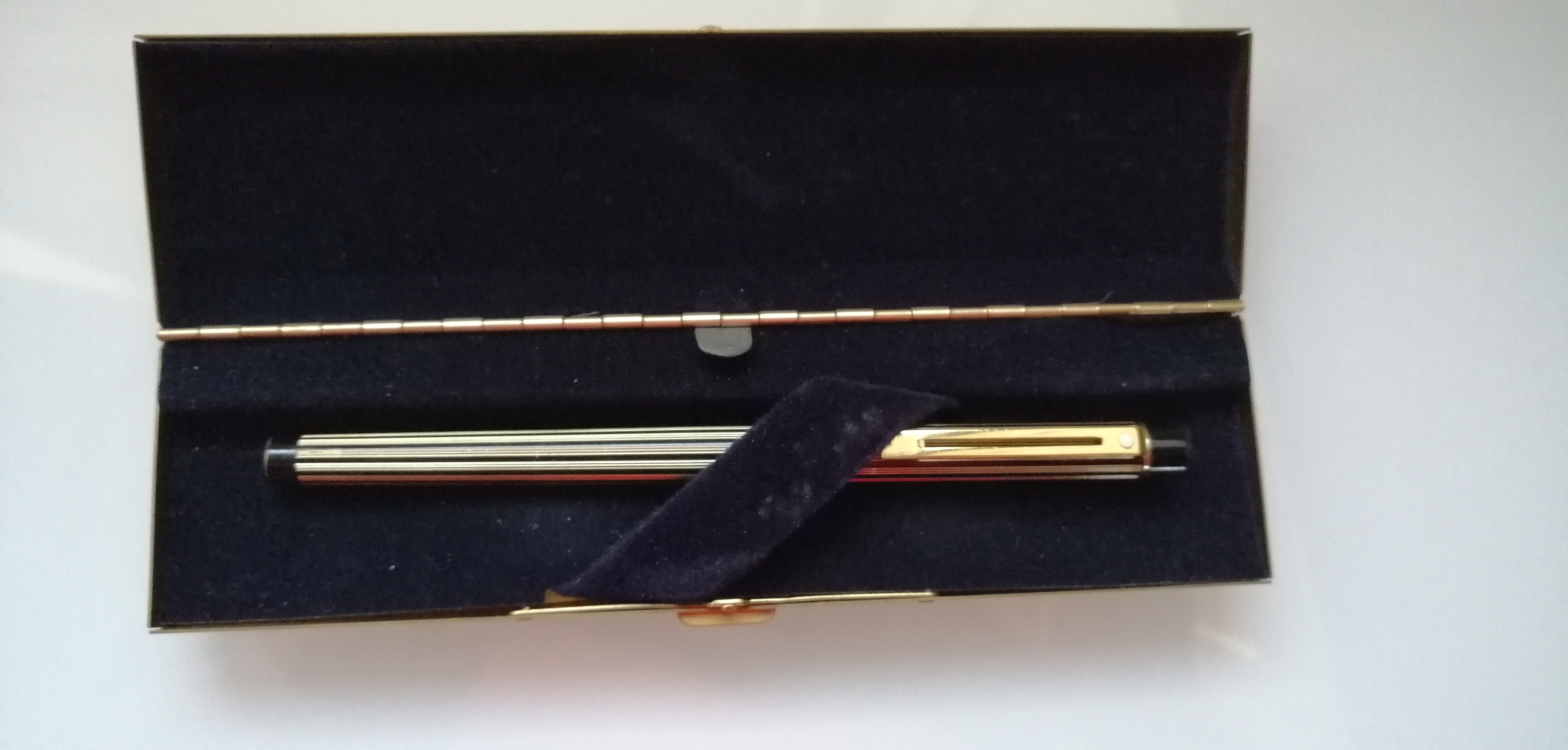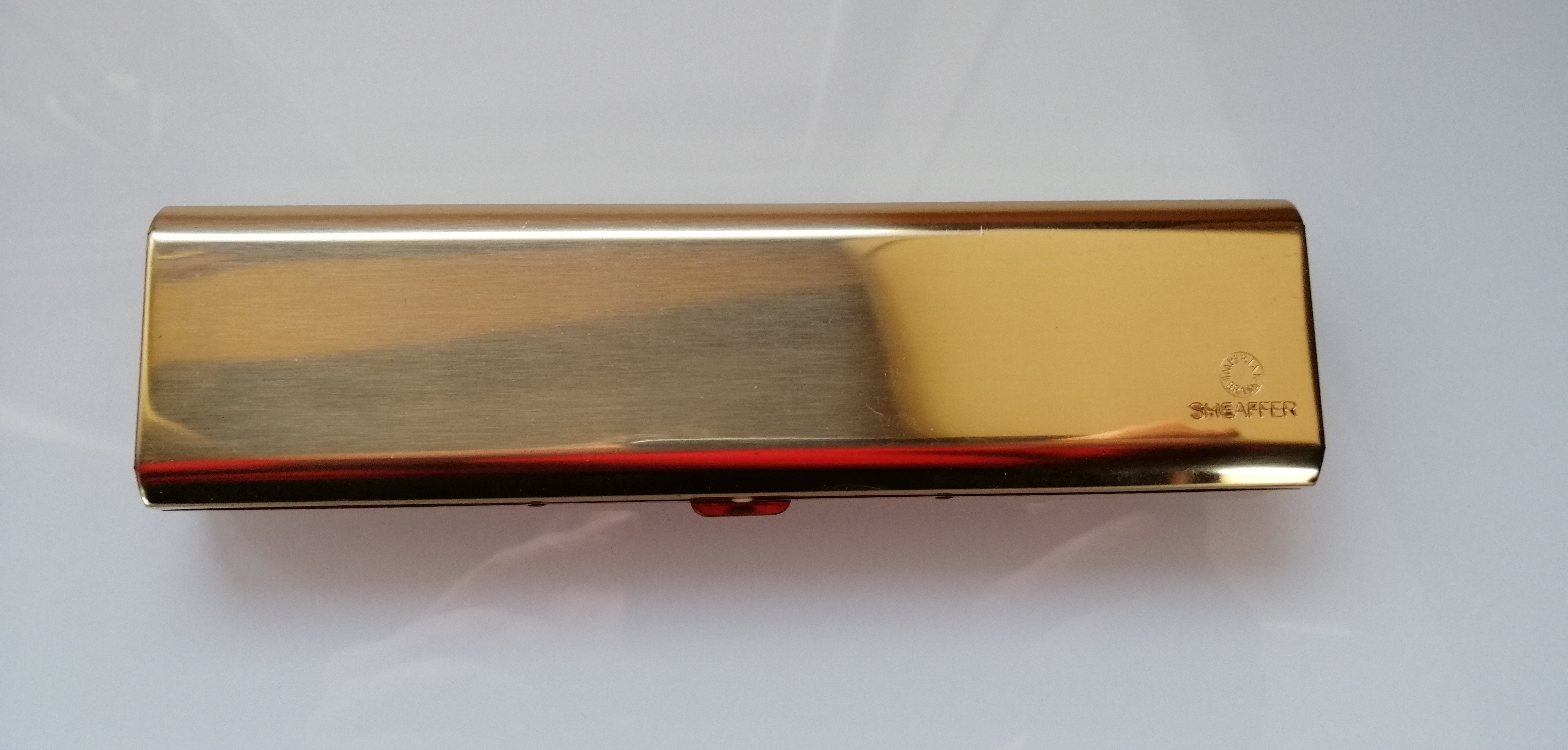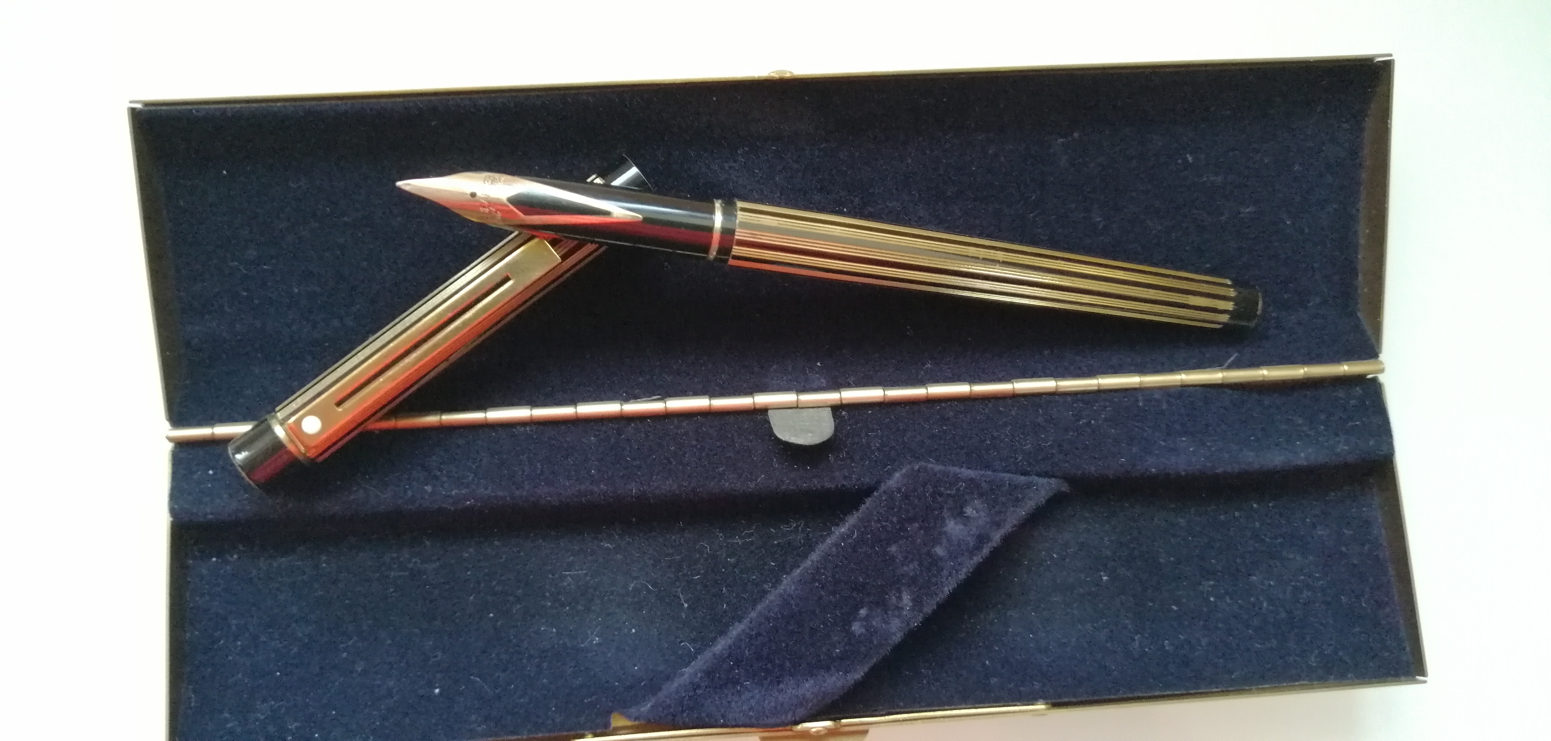 Ultimo arrivo: una Sheaffer Targa Regency Stripe con annesso astuccio in ottone (?). La devo ancora provare.