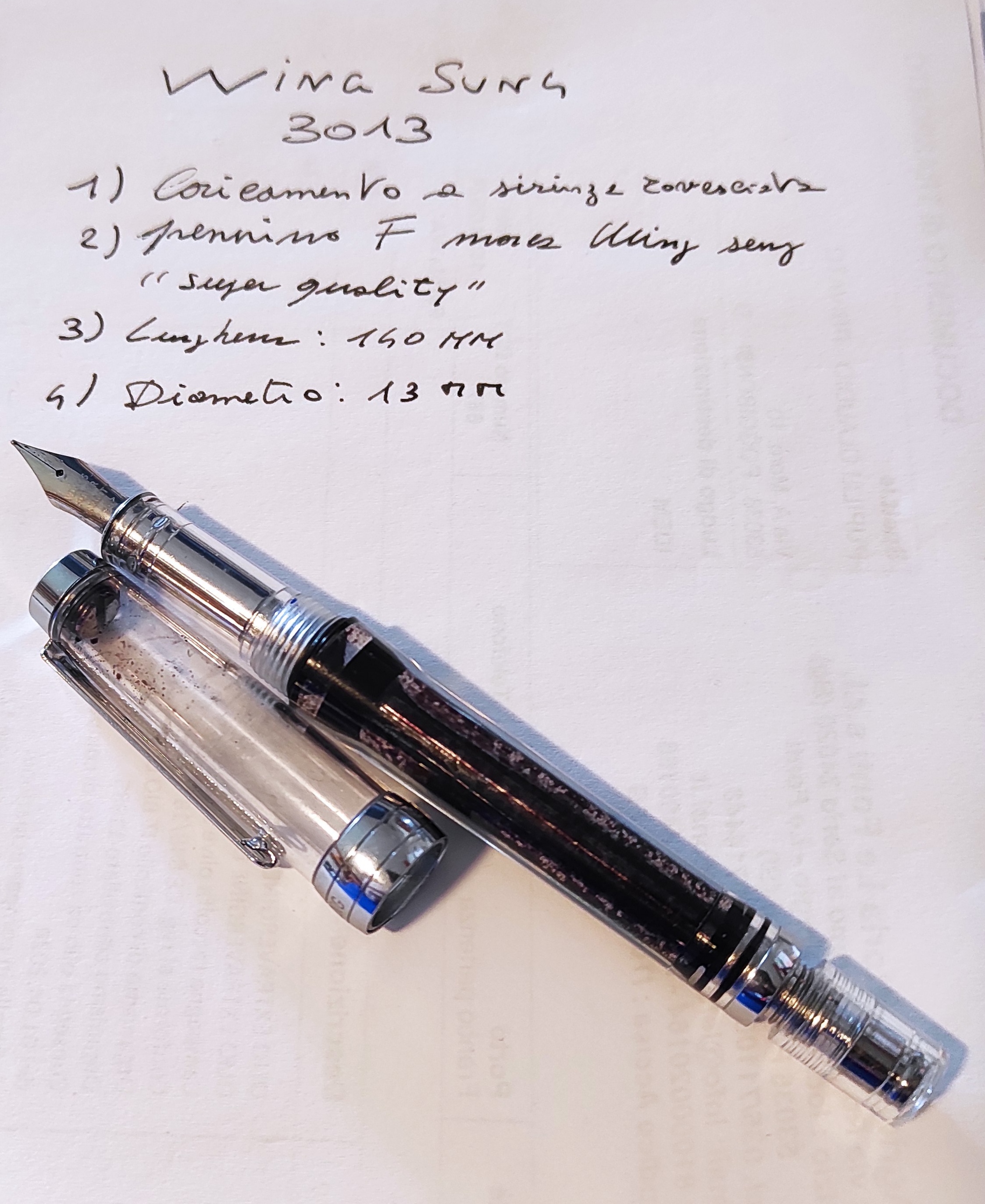 Wing Sung 3013, interessante col caricamento a siringa rovesciata, pennino F che per scrivere scrive, potrebbe farlo meglio ma lo fa, tende a perdere ogni tanto l'inchiostro.