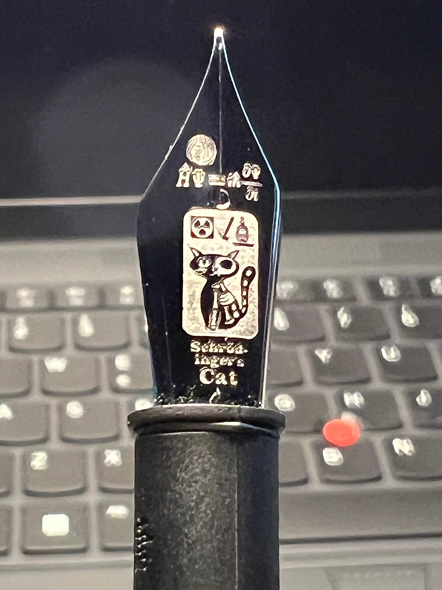 Eh.... secondo me, ma proprio secondo me eh....così a occhio, con la lente, a me sembra al laser; ma potrei dire una cavolata. Il pennino è piccolo....per tutte quelle incisioni ! Forse era meglio metter qualcosa in meno ? Vero che non ho una vista da falco, ma la formula in alto, che pure è incisa correttamente, a occhio nudo non riesco a leggerla.
