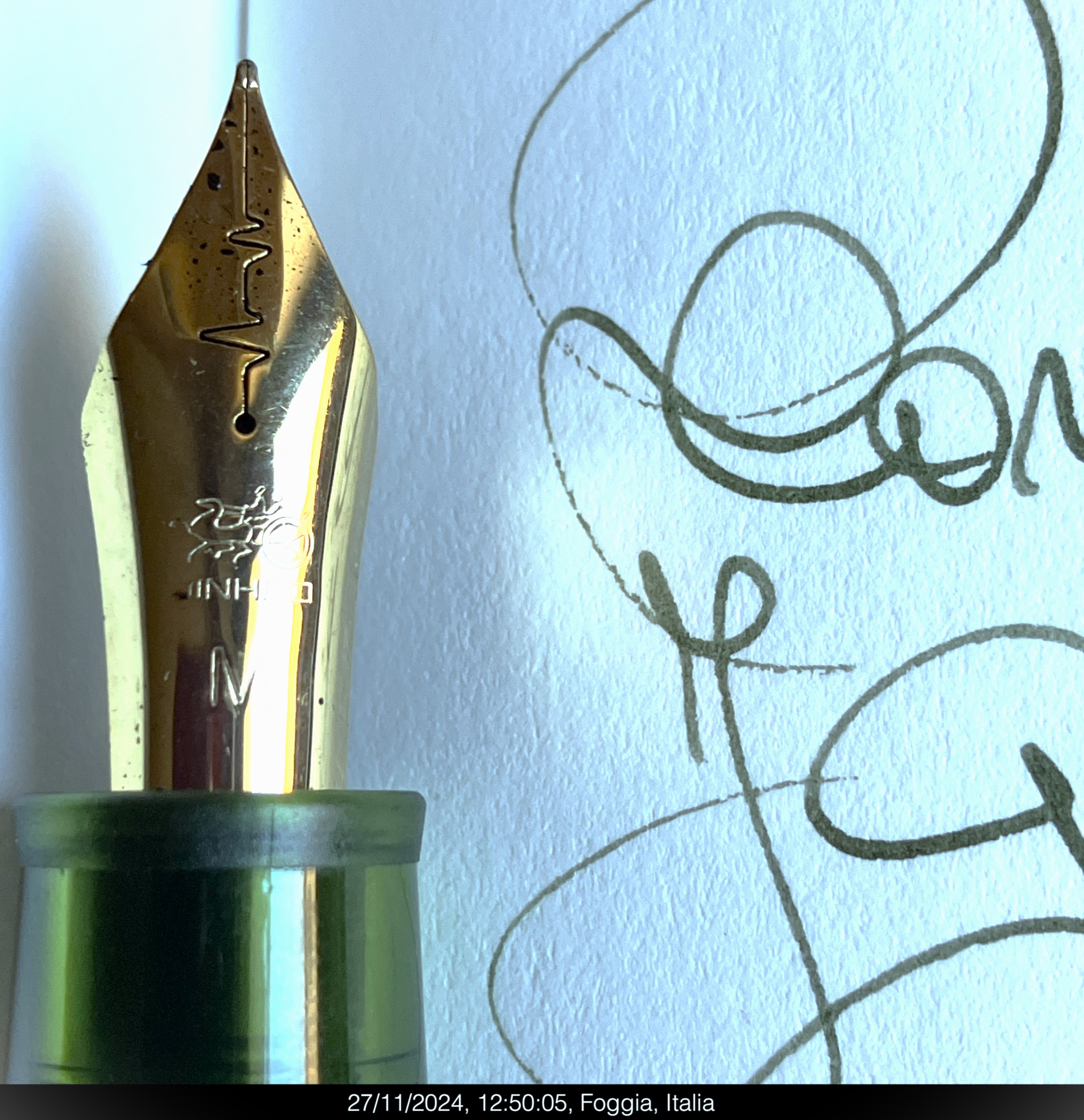 Nella stessa tornata, ho acquistato - era nei miei desideri da tempo - una 9019 Dadao verde oliva trasparente con pennino al "cardiopalma" che dal vero è ancora più simpatico che in foto. Ho caricato un inchiostro KWZ della serie IG (non trapassa la carta) Green Gold, il cui colore calza a pennello con la penna.