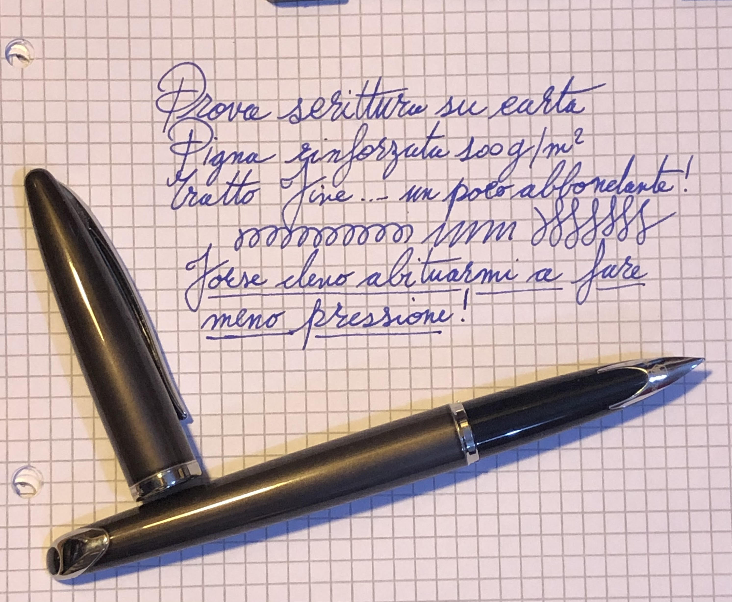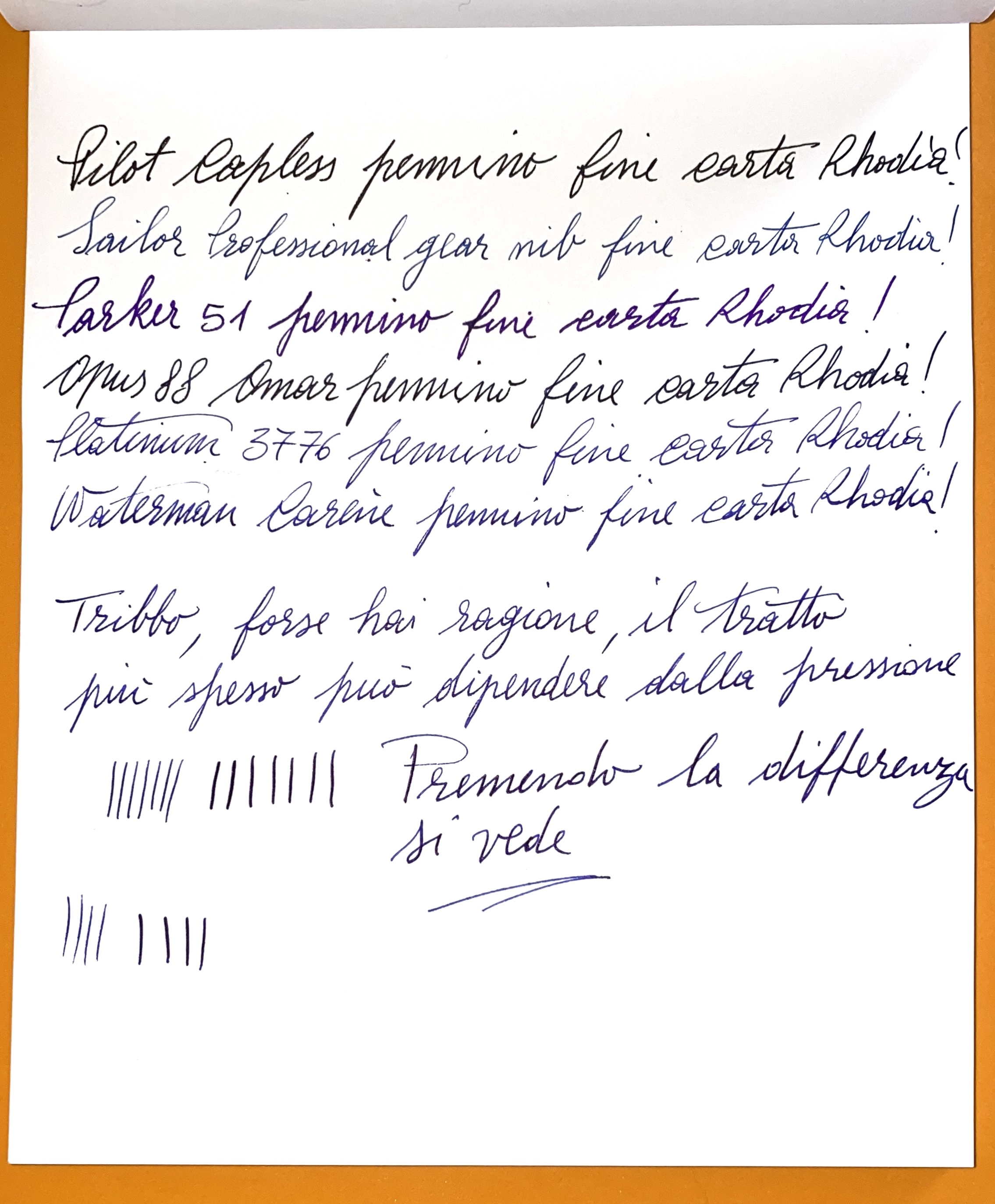 Inutile decantare la bontà della penna e del suo pennino, in quanto molte autorevoli recensioni e pareri sono già stati scritti in questo Forum. L'unica cosa è che.... nonostante il pennino sia un F, la scrittura è comunque un pò abbondante per me...
