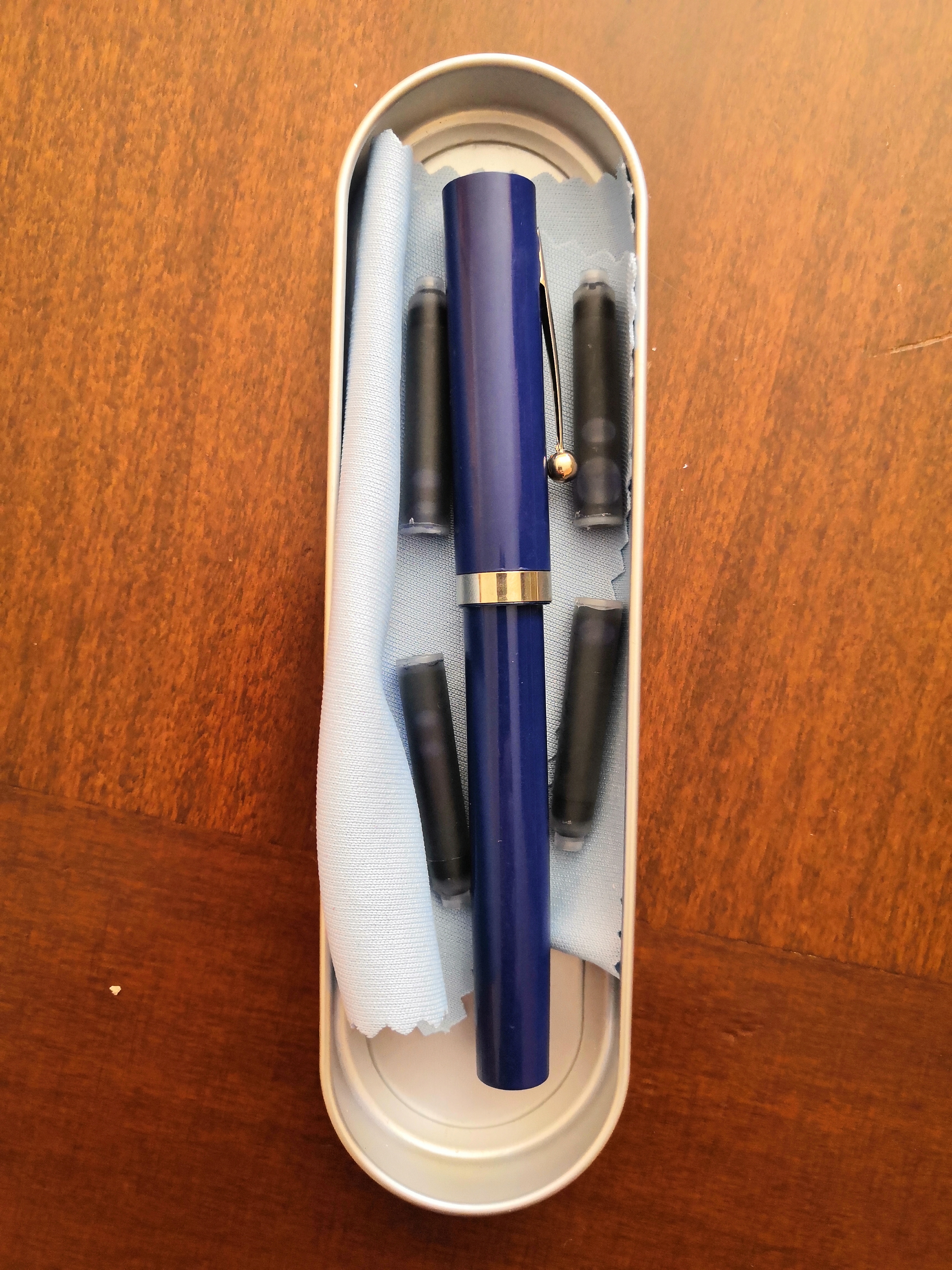 Ecco l'ultimo acquisto, fresco fresco, arrivato stamattina. Arrivato dall'India in circa 20 giorni, e costato meno di 10 euro, quasi la metà in effetti. Il gentile venditore mi ha omaggiato di scatoletta di metallo (ottima cosa così la penna viaggiava più protetta), 4 cartucce e pannetto per pulire la penna 😁