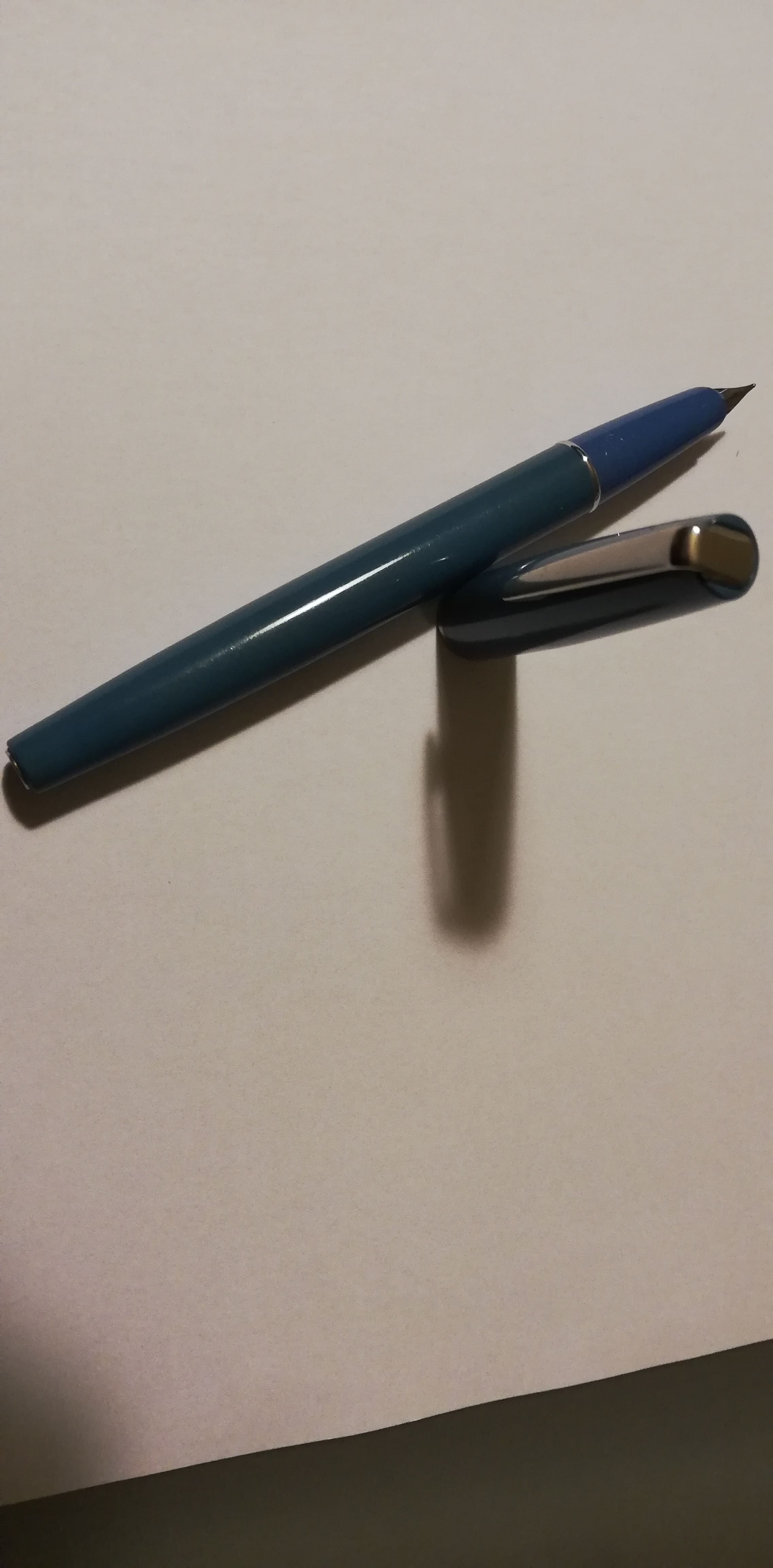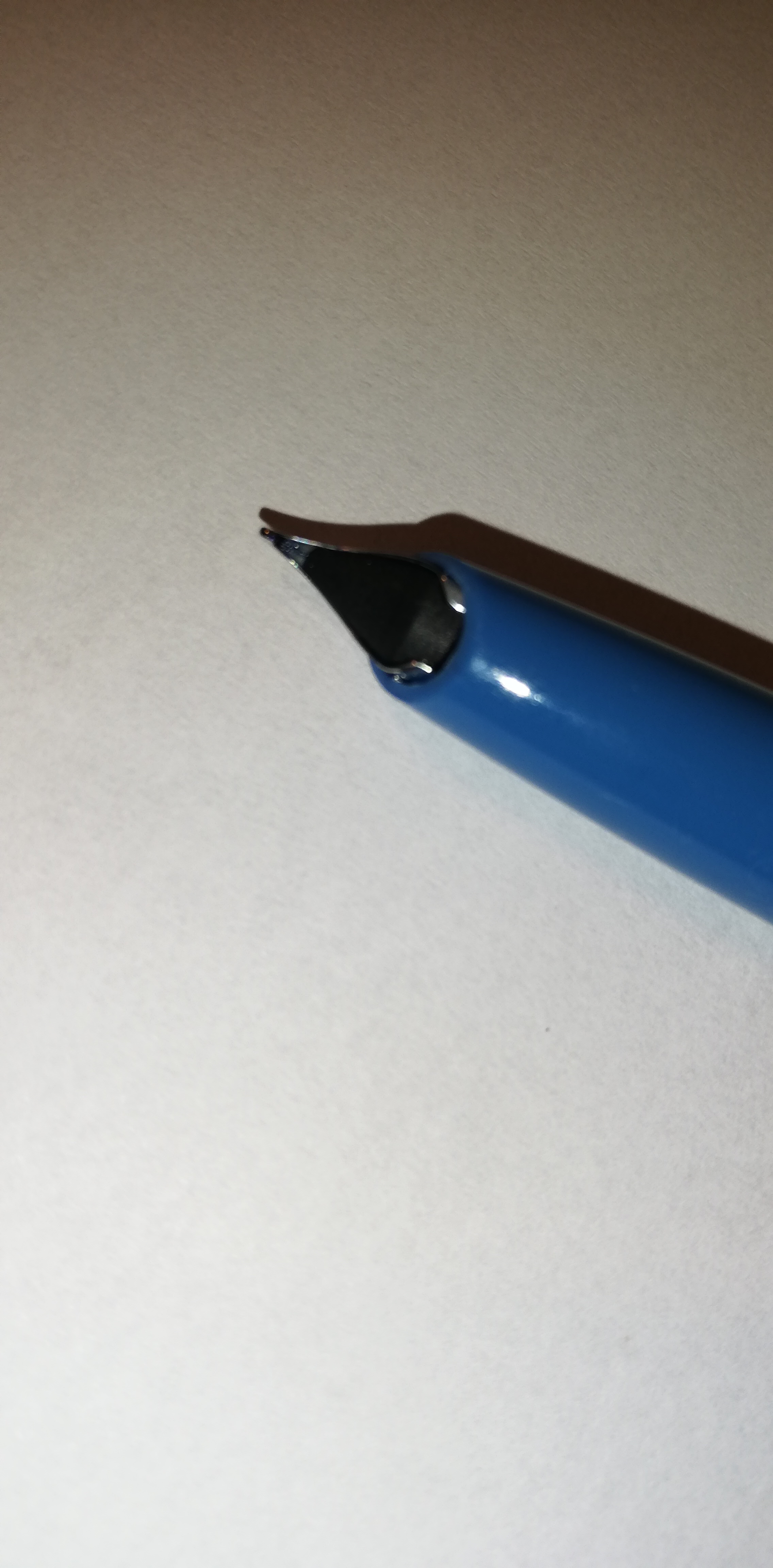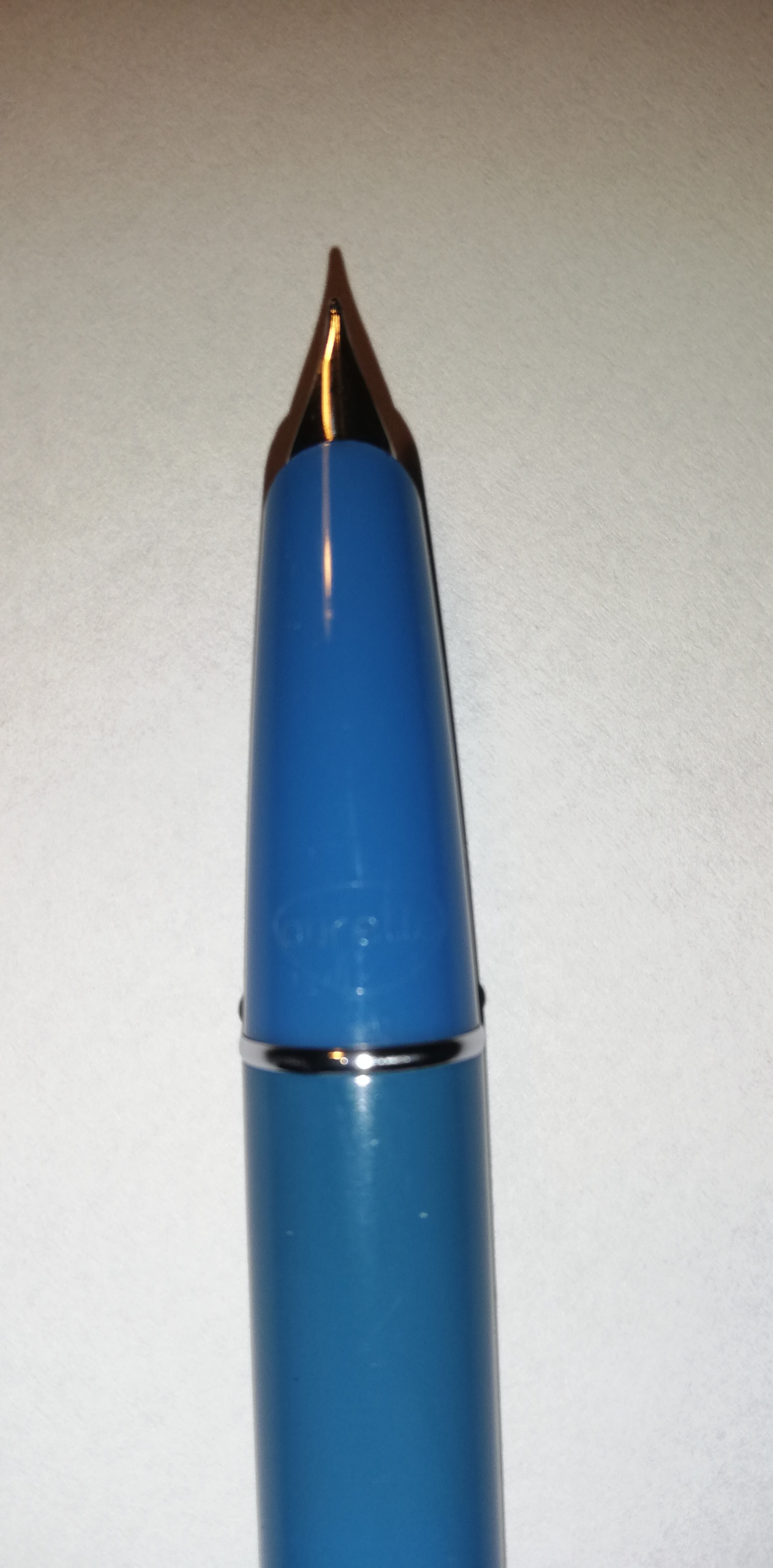 L'esemplare in mio possesso è dotato di un pennino decisamente grosso di cui non ho trovato alcuna identificazione sullo stesso, né sulla sezione. Inoltre l'erogazione di inchiostro risulta cospicua, al punto che in poco più di una giornata di impiego ha consumato circa la metà del contenuto della cartuccia. Dovrei provare l'inchiostro Black Blu Aurora che ho letto smagrisce l'erogazione data la limitata tensioattività.