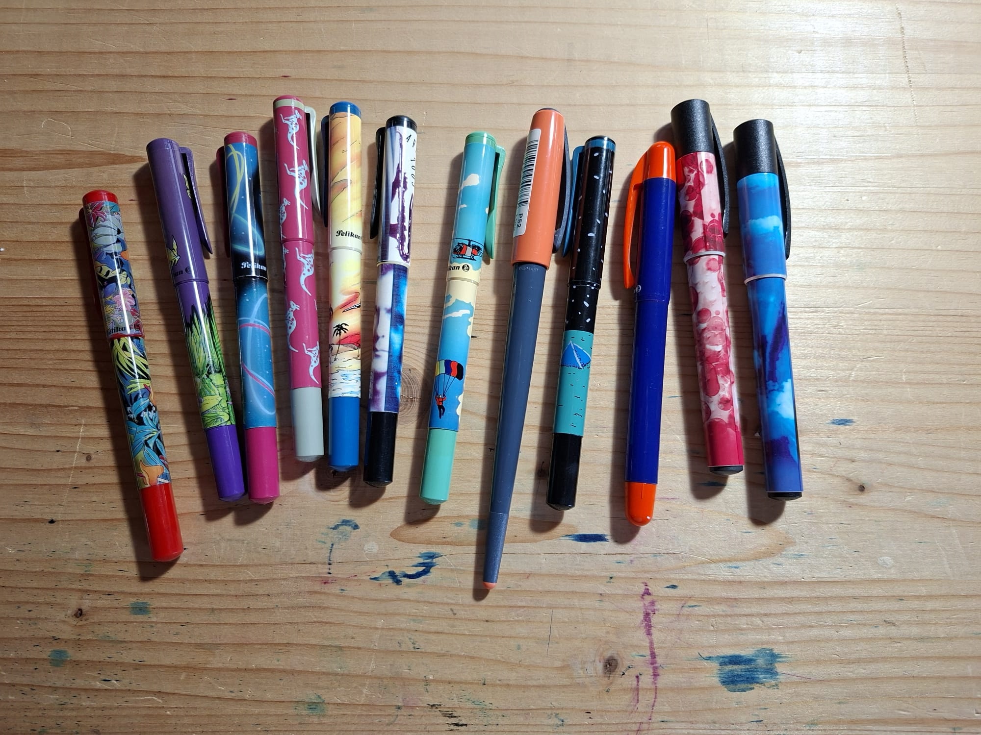 Capita poi che in quinta si appassionano, d'altronde vedono anche me che per correggere uso vari inchiostri colorati a seconda del momento; dunque qualcuno che cambia penna dall'anno precedente poi usa la "vecchia" con cartucce colorate per i titoli e va a scovare in qualche negozio del centro qualche altro tipo di cartucce - qualcuno ha scovato addirittura le cartucce Herbin