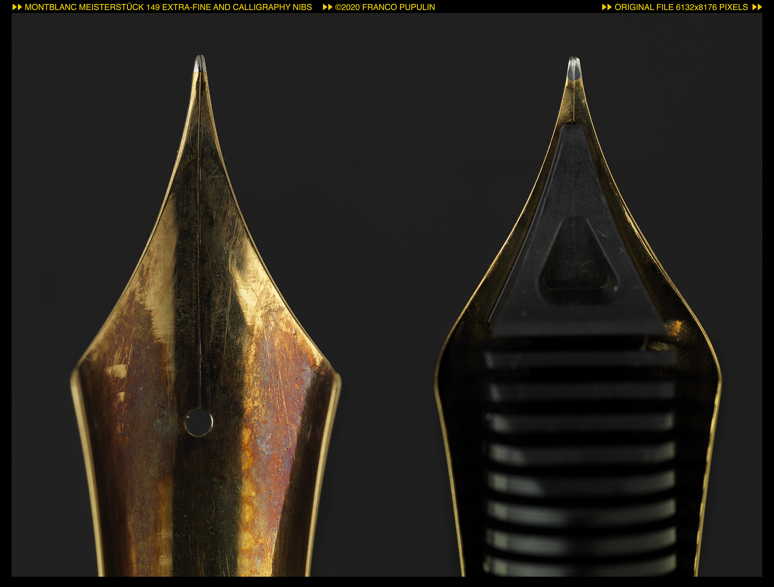 Oggi ho potuto fotografare con calma due pennini extra-fini delle mie 149, con date di produzione delle quali sono sicuro. I primo é il pennino che era installato sulla mia prima 149, acquistata nel dicembre del 1978, per cui risalente a quell'anno o tutt'al più al 1977. Il secondo é il pennino della mia ultima 149, la Calligraphy, acquistata nel 2020 e prodotta quest'anno o, forse, nel 2019.